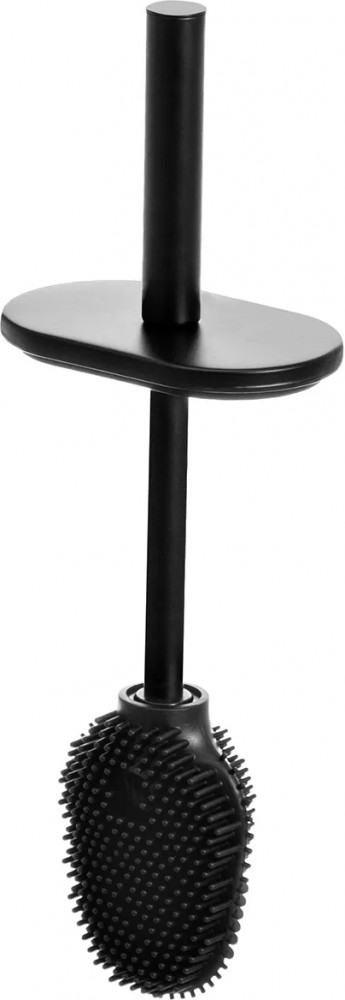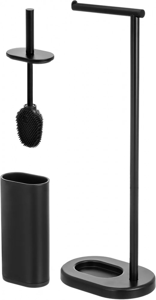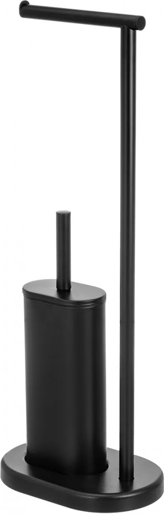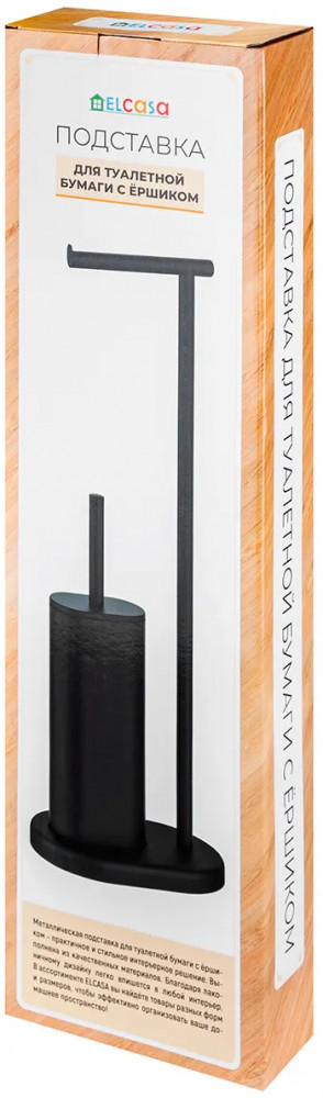 Подставка для туалетной бумаги с ёршиком от бренда El Casa общим размером 23,5×15,5×68 см выполнена из металла с пудровым покрытием и имеет пластиковые элементы. Вертикальный металлический держатель с подвесом для рулона имеет несгибаемую форму. Горизонтальный подвес для рулона вертикально не поднимается. Овальное основание (подставка) держателя выполнена из пластика. Ёрш с силиконовой щёточкой помещён в двойной контейнер размером 11,5×7,5×27 см. Внешняя часть контейнера выполнена из металла, внутренняя вставка — из пластика. Весь двойной контейнер снимается с подставки, поэтому его легко мыть. Поскольку мягкая щётка у ёршика выполнена из силикона, она легко удаляет загрязнения, не оставляет царапины на поверхности унитаза и легко отмывается.