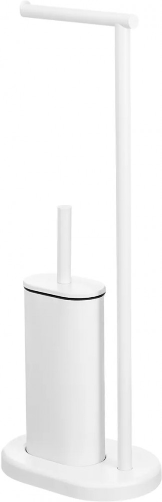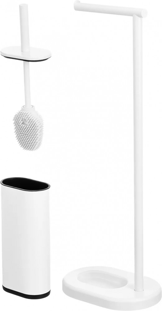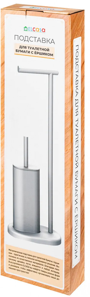 Подставка для туалетной бумаги с ёршиком от бренда El Casa общим размером 23,5×15,5×68 см выполнена из металла с пудровым покрытием и имеет пластиковые элементы. Вертикальный металлический держатель с подвесом для рулона имеет несгибаемую форму. Горизонтальный подвес для рулона вертикально не поднимается. Овальное основание (подставка) держателя выполнена из пластика. Ёрш с силиконовой щёточкой помещён в двойной контейнер размером 11,5×7,5×27 см. Внешняя часть контейнера выполнена из металла, внутренняя вставка — из пластика. Весь двойной контейнер снимается с подставки, поэтому его легко мыть. Поскольку мягкая щётка у ёршика выполнена из силикона, она легко удаляет загрязнения, не оставляет царапины на поверхности унитаза и легко отмывается.