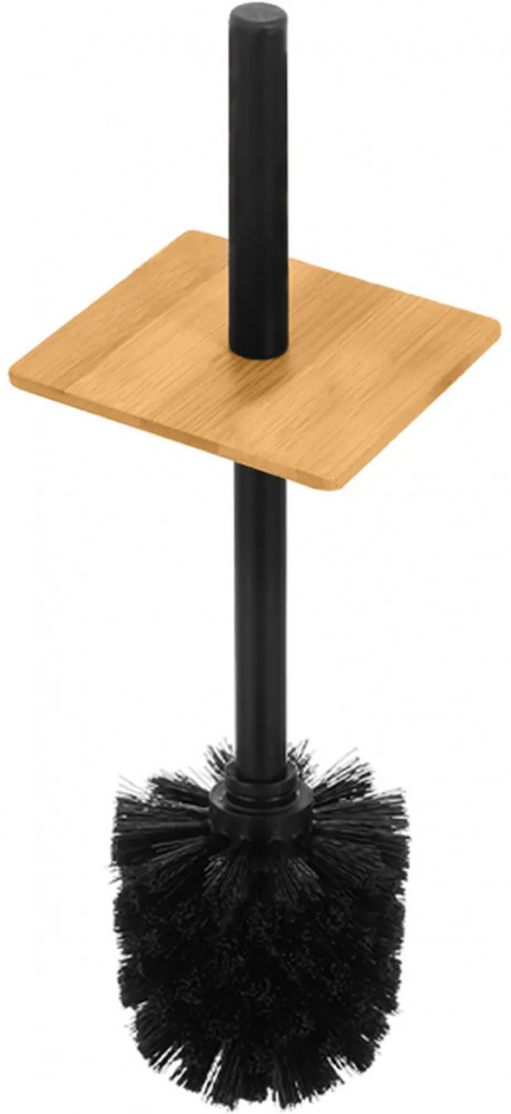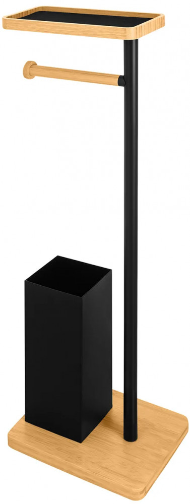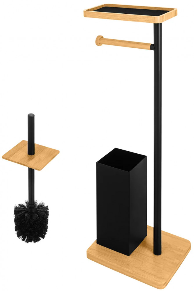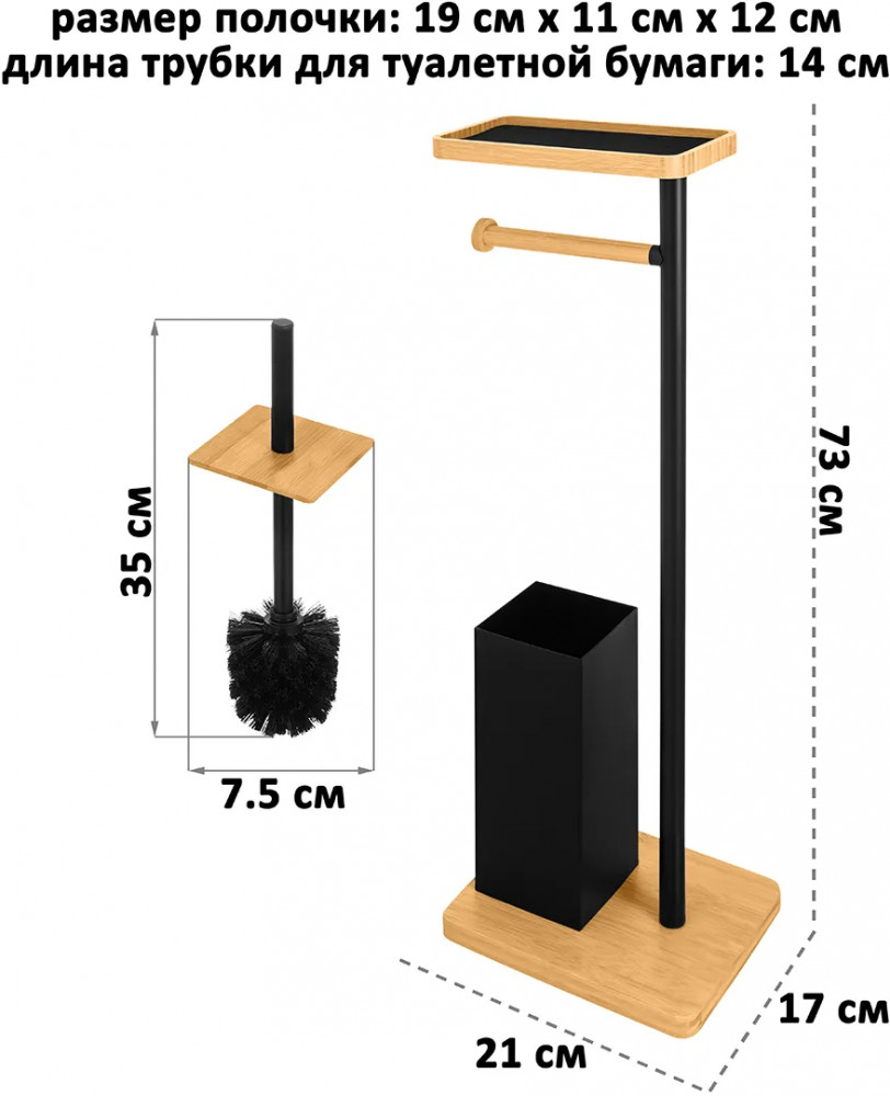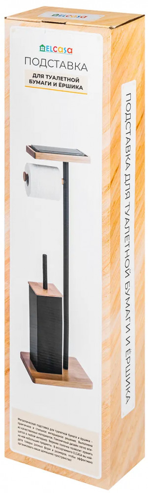 Подставка для туалетной бумаги с ёршиком и полочкой от бренда El Casa размером 21×17×73 см подойдет к любому интерьеру ванной или туалета, от минимализма до лофт. Состоит из следующих элементов: прямоугольное бамбуковое основание с металлическим контейнером для ёршика, ёршик с жёстким густым ворсом и квадратным бамбуковым элементом на пластиковой ручке, вертикальный металлический держатель, горизонтальный подвес для рулона из бамбука и бамбуковая полочка. Контейнер для ёршика из подставки не вынимается, прочно к ней прикреплён. Внутри контейнера есть круглый пластиковый чёрный стакан, который вынимается, поэтому его легко мыть от загрязнений с ёршика. Размер полки 19×11×2 см, размер внешней ёмкости для ершика 9,5×9,5×26 см, размер ёршика 7,5×7,5×35 см (длина ручки до бамбукового квадратного элемента 11 см). Бамбуковая полочка с бортиками имеет бархатную чёрную подкладку на дне. Подкладка вынимается.