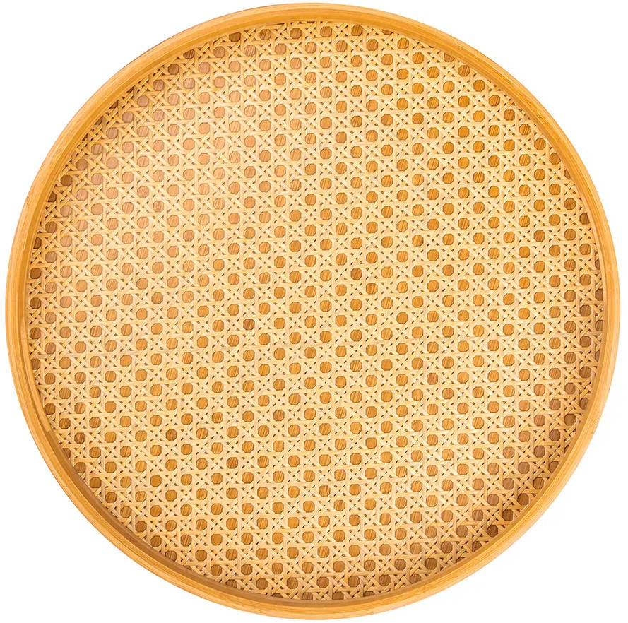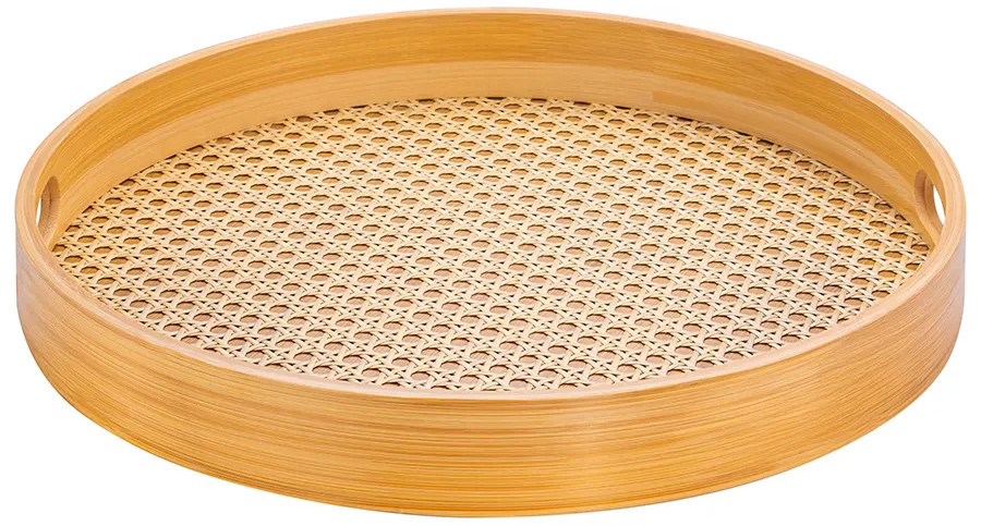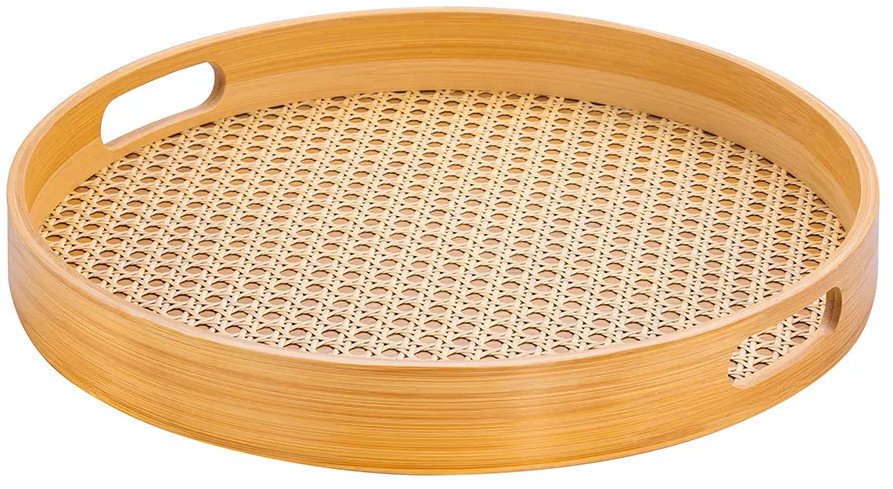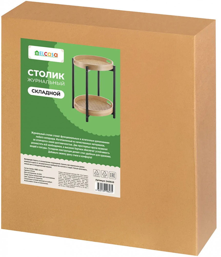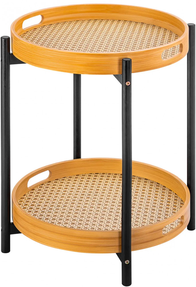 Журнальный столик 43×43×52 см со съёмными столешницами от бренда El Casa украсит домашний интерьер и позволит создать уютный уголок в квартире или на даче. Круглый стол подойдёт в роли кофейного, балконного или для украшения любого пространства в доме. Представляет собой этажерку из 2 ярусов, поэтому удобен для сервировки и хранения вещей. Оба яруса — это подносы с ручками, которые вынимаются. Их можно использовать по-отдельности, размер каждого 38,5×38,5×5 см. Подносы имеют боковые бортики из натурального бамбука, дно каждого изготовлено из МДФ и имеет пластиковый декор в виде изящного плетения. Внутренний диаметр каждого подноса — 36,5 см, максимальная нагрузка на один — 5 кг. Чёрное основание (ножки) выполнено из бамбука, не складывается. Конструкция целостная, поэтому устойчивая.