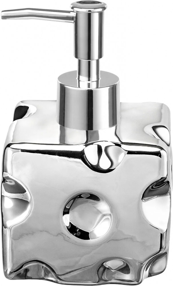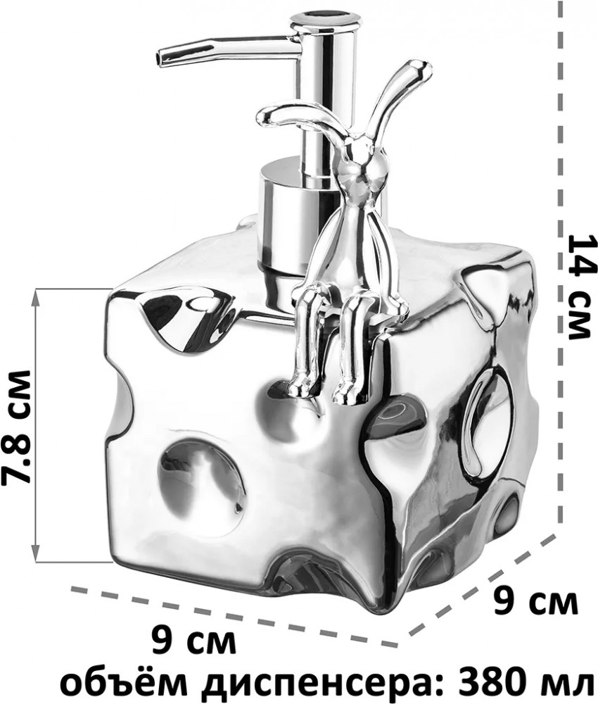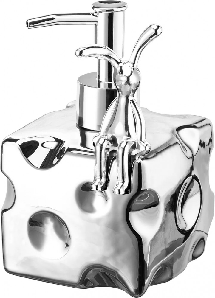 Настольный диспенсер в оттенке металлик (серебряный) от бренда Elan Gallery подойдёт для хранения жидких моющих и очищающих средств. Размер изделия — 9×9х14 см, объём — 380 мл. Квадратная ёмкость в форме сыра выполнена из керамики, её высота без пластикового дозатора 7,8 см. Поверхность имеет декоративный рельеф, имитирующий сырные дырочки. Дозатор на прямоугольной ёмкости выполнен из пластика. Он герметичен и надёжно предотвращает проливание.