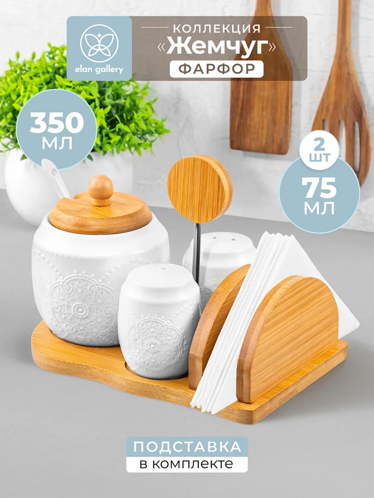 Elan Gallery Набор для специй с сахарницей и салфетницей на подставке с ручкой «Жемчуг»новинка -25%