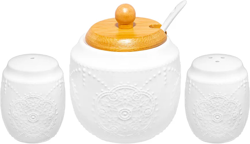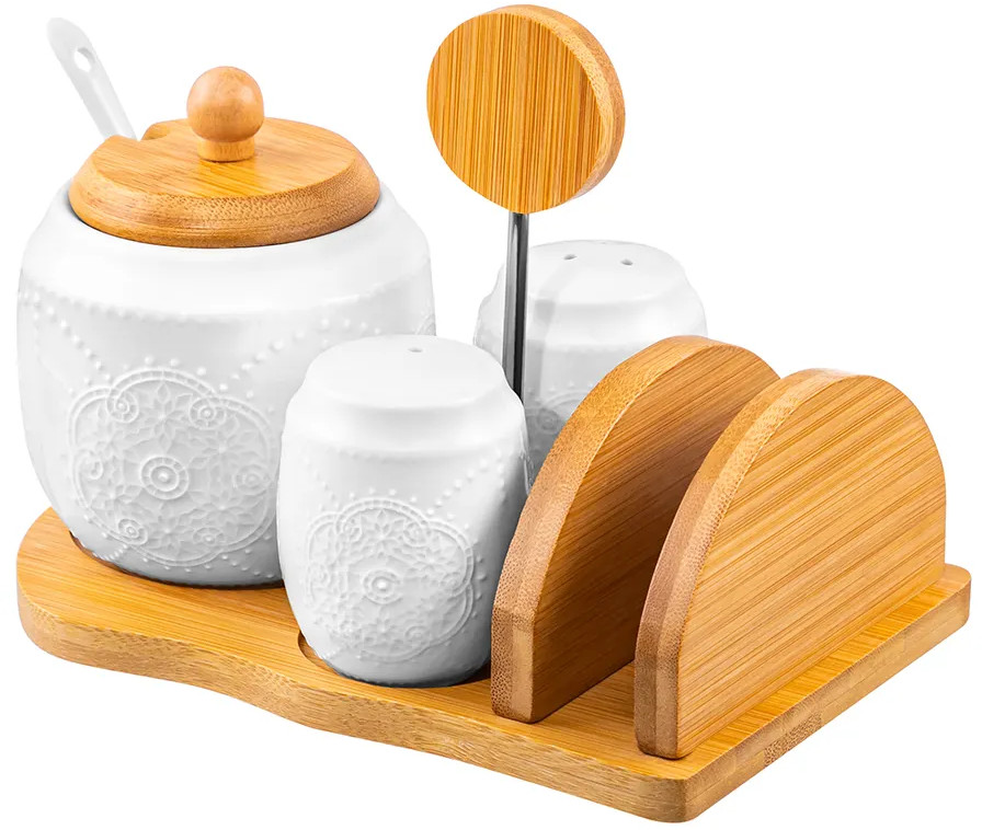 Серия: Жемчуг Набор посуды на бамбуковой подставке из серии «Жемчуг» от бренда Elan Gallery предназначен для эстетичной сервировки вашего стола. Включает сахарницу с ложкой, набор для специй и встроенную салфетницу. Комплект станет воплощением прекрасного вкуса. Размер подставки — 19×12,5×14 см. По центру она оснащена ручкой в виде металлической оси с круглым декоративным элементом. Выполнена из натурального бамбука. Посуда выполнена из высококачественного белого фарфора. Он не впитывает цвет продуктов и легко отмывается, благодаря чему надолго сохраняет свою белизну. Поверхность изделия украшают рельефные узоры, напоминающие тонкое кружево. Размер сахарницы — 9×9х11 см, объём — 350 мл. Подойдёт для сахара, соли и других сыпучих продуктов. Подайте её вместе с горячими блюдами, чтобы каждый мог приправить пищу по своему вкусу. |