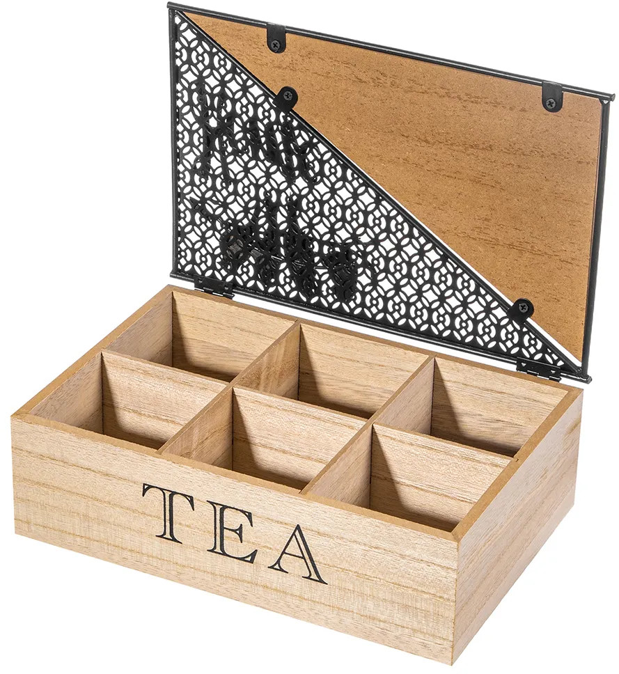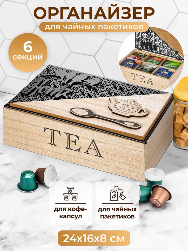 💳 Оплатить за товар можно при получении 🇰🇿 Есть бесплатная доставка по Казахстану от 1 дня 🎁 Копите бонусы с каждой покупки Органайзер для чайных пакетиков от Elan Gallery — это удобное решение для любителей чая. Имеет 6 секций внутри. Размер коробочки — 24×16×8,5 см, размер каждого отделения — 7,5×7х6,5 см. Высота без крышки 7 см. Контейнер с отсеками изготовлен из МДФ, имеет элементы из металла. Выполнен в стильном дизайне в виде сундучка с множеством декоративных элементов на крышке. Украшен надписями «100% tea» («100% чая»), «Home» («Дом») и «Tea» («Чай»). Откидная крышечка защищает чайные пакеты от пыли и других внешних факторов. |