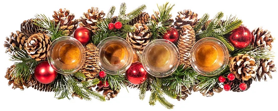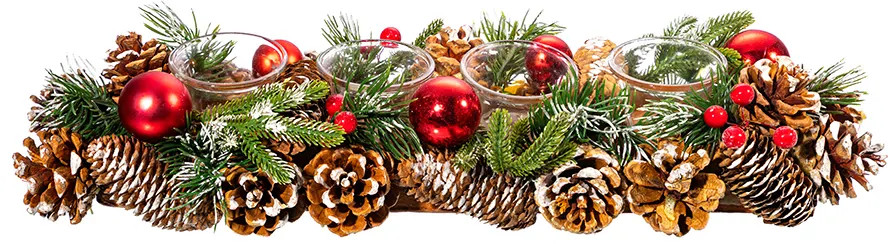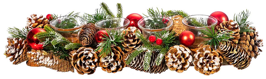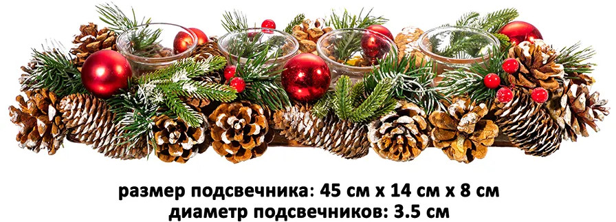 Новогоднее украшение (подсвечник) от Elan Gallery размером 45×14×8 см принесет в ваш дом атмосферу тепла, радости и уюта! Рождественский декор «Заснеженные шишки» представляет собой стеклянные стаканчики для 4 свечей, плотно закрепленных на толстой основе из пенопласта прямоугольной формы. Внутренний диаметр каждого стеклянного подсвечника — 3,5 см. Можно поставить на стол со скатертью, полку или тумбу. Плотная подставка украшена новогодним и рождественским декором. Вся композиция закреплена на прочной основе, каждый стакан из стекла приклеен, из подставки не вынимается. В составе использованы настоящие сосновые шишки, искусственные еловые ветки с красными новогодними шарами и декором в виде ягод.