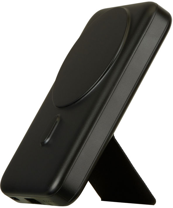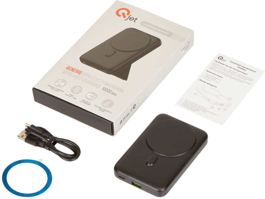Продвинутый повербанк с уникальным стилем. Ёмкости 10000 мАч хватает в среднем на 2,5-3 зарядки смартфона. GenerIQ поддерживает быструю беспроводную зарядку 15 Вт с авто-включением: просто поднесите смартфон к повербанку — он мгновенно примагнитится и начнется зарядка. Если смартфон поддерживает беспроводную зарядку по стандарту Qi. Беспроводная зарядка будет работать и во время зарядки самого повербанка. Металлическое кольцо для смартфонов на Android в комплекте. Также поддерживается и быстрая зарядка по кабелю с обоих портов (USB-C и USB-A). Кабель для быстрой зарядки в комплекте. Сзади расположена пластичная складная подставка из качественного полиуретана с зернистой текстурой. В развернутом виде на столе подставка позволяет пользоваться смартфоном одной рукой, при этом, благодаря магнитным держателям, смартфон может быть расположен как вертикально, так и горизонтально. Повербанк компактный и не загораживает объективы камер у большинства моделей. Фронтальная часть выполнена в минималистичном дизайне, чтобы не отвлекать внимание от нанесенного логотипа, а наоборот подчеркивать его.