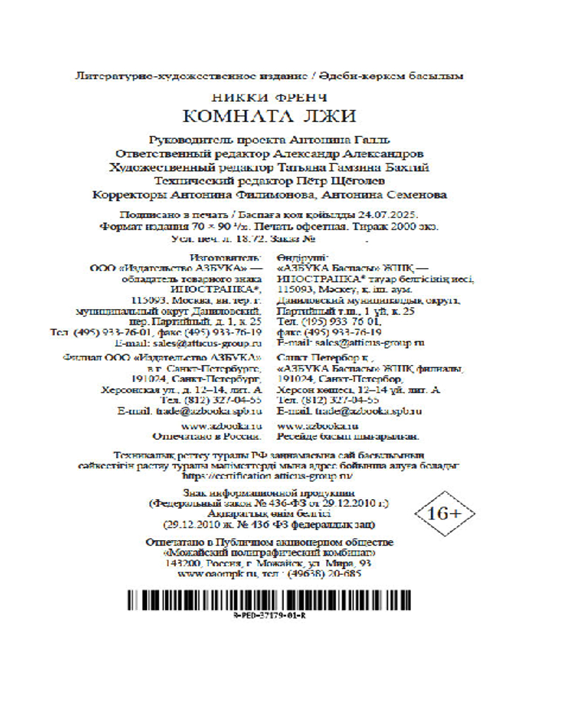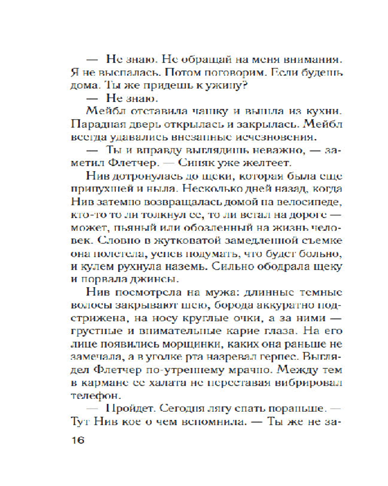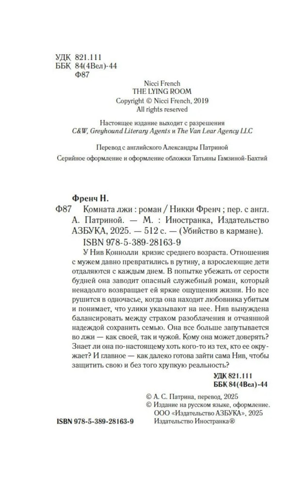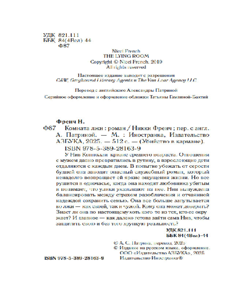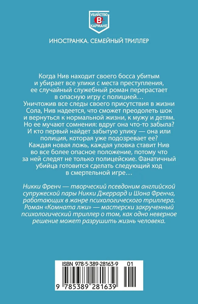 Серия: Убийство в кармане У Нив Коннолли кризис среднего возраста. Отношения с мужем давно превратились в рутину, а взрослеющие дети отдаляются с каждым днем. В попытке убежать от серости будней она заводит опасный служебный роман, который ненадолго возвращает ей яркие ощущения жизни. Но все рушится в одночасье, когда она находит любовника убитым и понимает, что улики указывают на нее. Нив вынуждена балансировать между страхом разоблачения и отчаянной надеждой сохранить семью. Она все больше запутывается во лжи — как своей, так и чужой. Кому она может доверять? Знает ли она по-настоящему хоть кого-то из тех, кто ее окружает? И главное — как далеко готова зайти сама Нив, чтобы защитить свою и без того хрупкую реальность? |