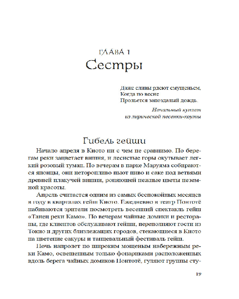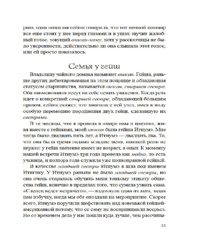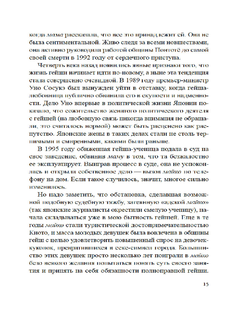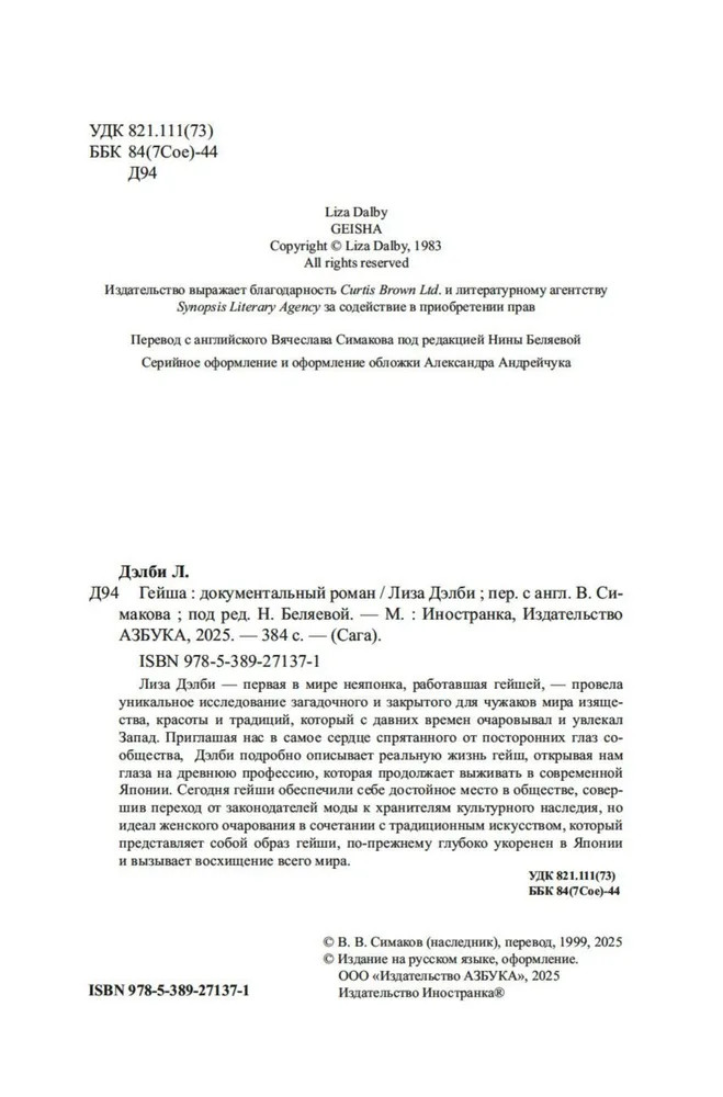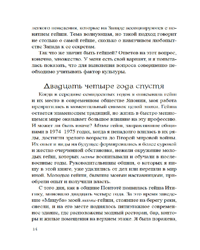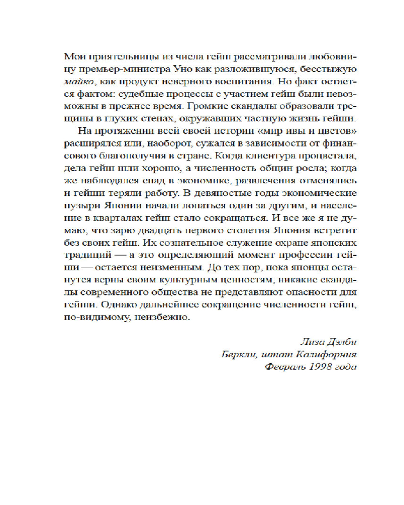 Лиза Дэлби — первая в мире неяпонка, работавшая гейшей, — провела уникальное исследование загадочного и закрытого для чужаков мира изящества, красоты и традиций, который с давних времен очаровывал и увлекал Запад. Приглашая нас в самое сердце спрятанного от посторонних глаз сообщества, Дэлби подробно описывает реальную жизнь гейш, открывая нам глаза на древнюю профессию, которая продолжает выживать в современной Японии. Сегодня гейши обеспечили себе достойное место в обществе, совершив переход от законодателей моды к хранителям культурного наследия, но идеал женского очарования в сочетании с традиционным искусством, который представляет собой образ гейши, по-прежнему глубоко укоренен в Японии и вызывает восхищение всего мира.