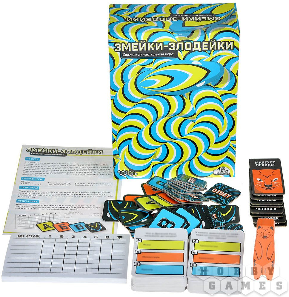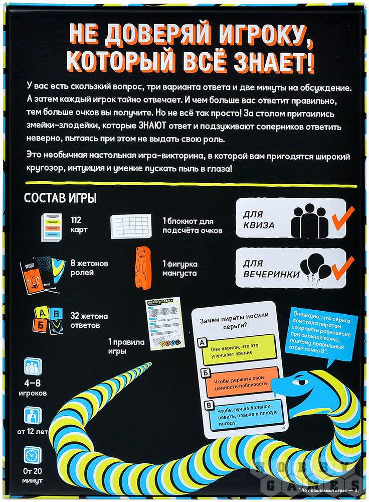 «Змейки-злодейки» — это настольная игра-викторина со скрытыми ролями, которая отлично подходит для дружеской посиделки или даже небольшой вечеринки. Повинуясь воле Жетонов Судьбы, вы разделитесь на две группы: на команду людей и команду змеек. Но есть загвоздка: люди не будут знать, кто из верных товарищей на самом деле змейка, а змейки будут изо всех сил мешать людям победить. Каждый ход вы будете тянуть карты с вопросами, но приготовьтесь к тому, что вопросы эти окажутся по-настоящему с-скользкие — придётся хорошенько подумать! Но только людям, не змейкам... Они будут знать правильный ответ. Наберёте ли вы больше всех баллов в этой непростой викторине? |