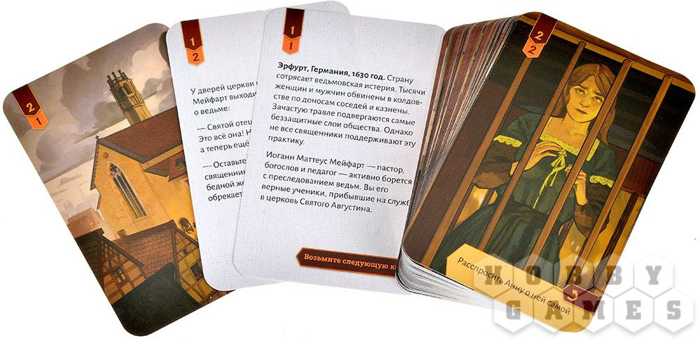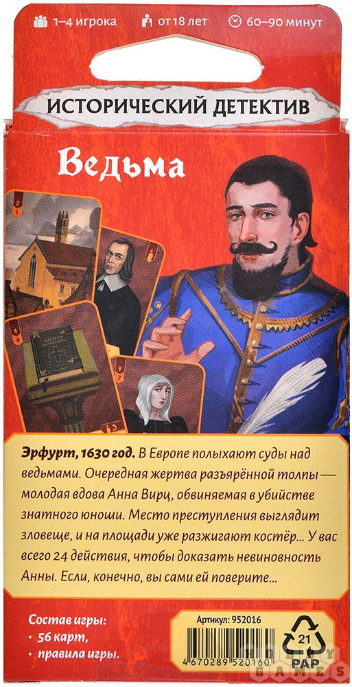 В игре «Исторический детектив: Ведьма» игроки берут на себя роли сыщиков, которым было поручено расследовать это нелёгкое дело. Для проведения партии понадобится мобильный телефон с функцией чтения QR-кодов — это необходимо, чтобы в финале определить, насколько ваши догадки близки к истине. Вы ограничены 24 ходами — а потому следует тщательно планировать действия и анализировать каждый шаг. Опросить знакомых и родственников убитого? Внимательно осмотреть место преступления? Собрать показания свидетелей? Вариантов много, и каждый по-своему приблизит вас к разгадке. Вопрос в том, сумеете ли вы выстроить цельную картину из крупиц истины и намёков... |