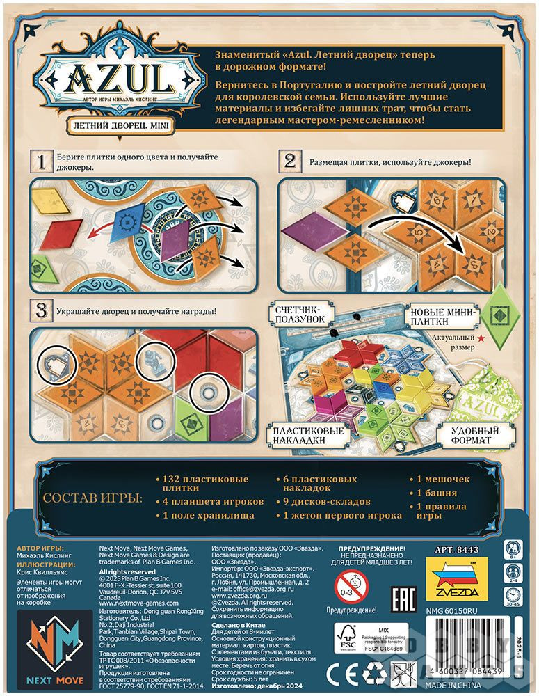 Серия: Азул «Азул: Летний дворец. Мини» — это компактная версия знаменитой игры «Азул: Летний дворец», в которой вам предстоит собирать изысканные мозаики и выкладывать узоры во славу королевской династии. Используйте лучшие материалы, следите за балансом ресурсов и продумывайте свои ходы, чтобы опередить соперников и создать настоящий архитектурный шедевр. |