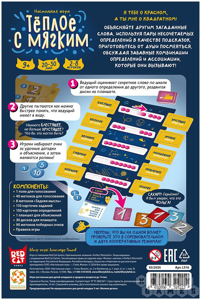 💳 Оплатить за товар можно при получении 🇰🇿 Есть бесплатная доставка по Казахстану 🎁 Копите бонусы с каждой покупки «Тёплое с мягким» — это динамичная вечериночная игра, где каждый по очереди становится ведущим и объясняет загаданное слово, используя планшет с дисками и пары противоречивых, часто не имеющих ничего общего определений. Чем абсурднее подсказки — тем интереснее! Игроки должны угадать слово, ориентируясь на ассоциации ведущего. Конечно же, самые проницательные получают победные очки! В игре два режима: в соревновательном каждый из вас борется за лидерство, а в кооперативном вы действуете сообща, чтобы проверить, насколько хорошо понимаете друг друга. Смешные провалы, неожиданные озарения и бурные обсуждения гарантированы! |