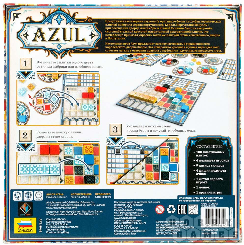 Серия: Азул «Азул» покоряет своим красочным оформлением, глубоким игровым процессом, а также простыми в освоении правилами. От двух до четырёх игроков примут участие в создании неповторимых орнаментов для украшения стен королевского дворца. Игроки по очереди набирают цветную плитку, всякий раз беря её по одному цвету из предлагаемых комплектов, чтобы раньше соперников выполнить заказ по облицовке дворца.. Создавая из ярких плиток красивые узоры, игроки получают победные очки, которые и определяют победителя в конце игры. |