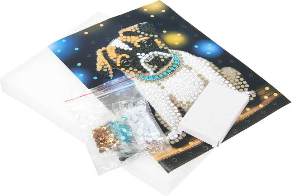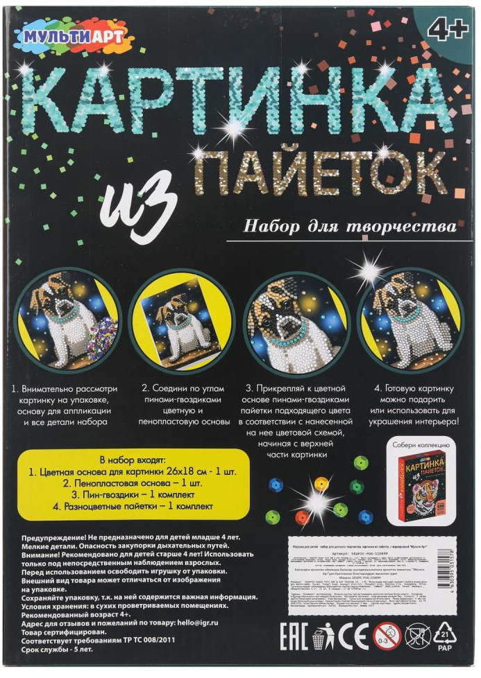 Набор для творчества — картина из пайеток «Мопс» ТМ «Мульти Арт» — отличный подарок для маленького художника. С помощью красочной основы и сверкающих пайеток, прикрепляемых к ней гвоздиками, ребёнок сможет самостоятельно создать красивую блестящую картину с изображением симпатичного мопса. Готовую поделку можно подарить близким или использовать для украшения интерьера.