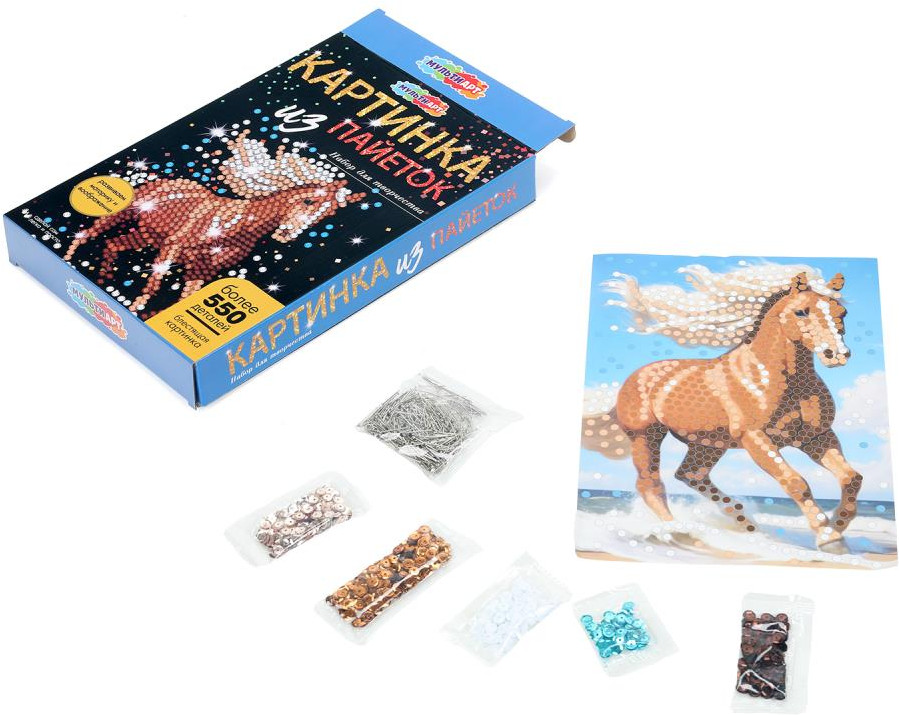 Набор для творчества — картина из пайеток «Лошадь» ТМ «Мульти Арт» — отличный подарок для маленького художника. С помощью красочной основы и сверкающих пайеток, прикрепляемых к ней гвоздиками, ребёнок сможет самостоятельно создать красивую блестящую картину с изображением лошади. Готовую поделку можно подарить близким или использовать для украшения интерьера. |