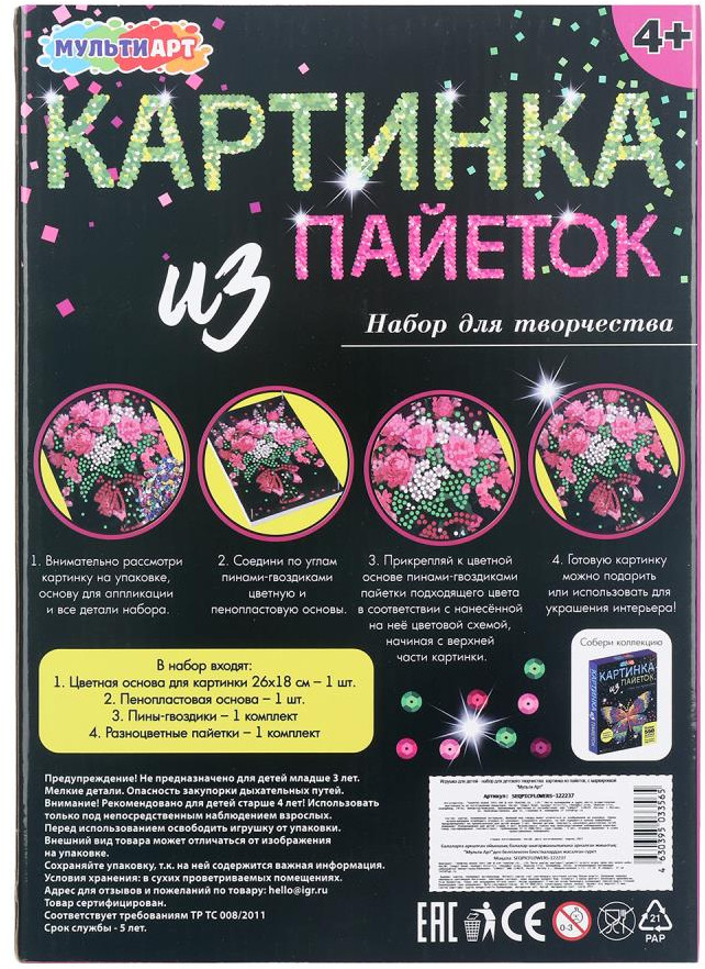 💳 Оплатить за товар можно при получении 🇰🇿 Есть бесплатная доставка по Казахстану от 1 дня 🎁 Копите бонусы с каждой покупки Набор для творчества — картина из пайеток «Букет» ТМ «Мульти Арт» — отличный подарок для маленького художника. С помощью красочной основы и сверкающих пайеток, прикрепляемых к ней гвоздиками, ребёнок сможет самостоятельно создать красивую блестящую картину с изображением букета. Готовую поделку можно подарить близким или использовать для украшения интерьера. |