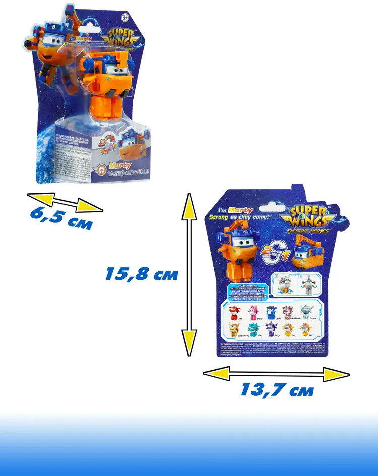 Детский мини-трансформер Марти из команды 8 сезона «Супер Крыльев» превратит обычную игру в увлекательное приключение. Легким движением руки игрушка удивительным образом превращается из скоростного самолета в мощного робота, у которого двигаются руки и ножки! Герой на колесиках станет верным другом для вашего ребенка и дополнит коллекцию персонажей из любимого мультика. Игрушка выполнена из качественного пластика, безопасная для ребенка и приятная на ощупь, а яркие цвета фигурки никого не оставят равнодушным! Благодаря компактному размеру трансформер удобно брать с собой куда угодно — будь то прогулка или поездка. Это отличный подарок для маленьких поклонников «Супер Крыльев» на любой праздник! Трансформер подходит как для самостоятельных игр, так и для сюжетных развлечений в компании друзей, он не только увлечет малыша и подарит радость от игры, но и поспособствует развитию мелкой моторики и богатого воображения!  |