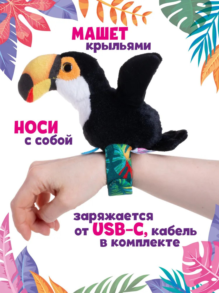 Познакомьтесь с очаровательными Чирикашками — интерактивная игрушка со слэп-браслетом Happy Yappers «Тукан» обязательно привлечет внимание вашего ребенка! Эта веселая игрушка станет отличным компаньоном для игр и развлечений. Птичка надевается на руку как браслет и может всегда быть рядом с ребенком, также она умеет повторять слова, создавая атмосферу веселья и смеха. Она не только развлекает, но и развивает у ребенка слух и речь. Ваш малыш будет в восторге от того, как игрушка подхватывает звуки и фразы. Это прекрасная возможность для совместного времяпрепровождения. Кроме того, милый Тукан может петь песенки! Он добавит нотку радости в повседневные занятия и подарит много приятных моментов. Улыбка вашего ребенка гарантирована, когда эта озорная птичка начнет выполнять свои музыкальные номера! |