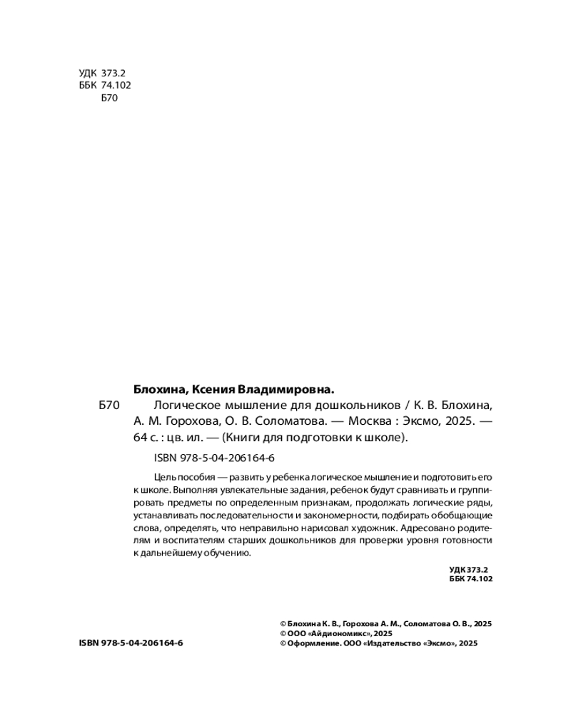 Логическое мышление для дошкольниковАнна Михайловна Горохова, Ксения Владимировна Блохина, Ольга Валерьевна Соломатова -20%