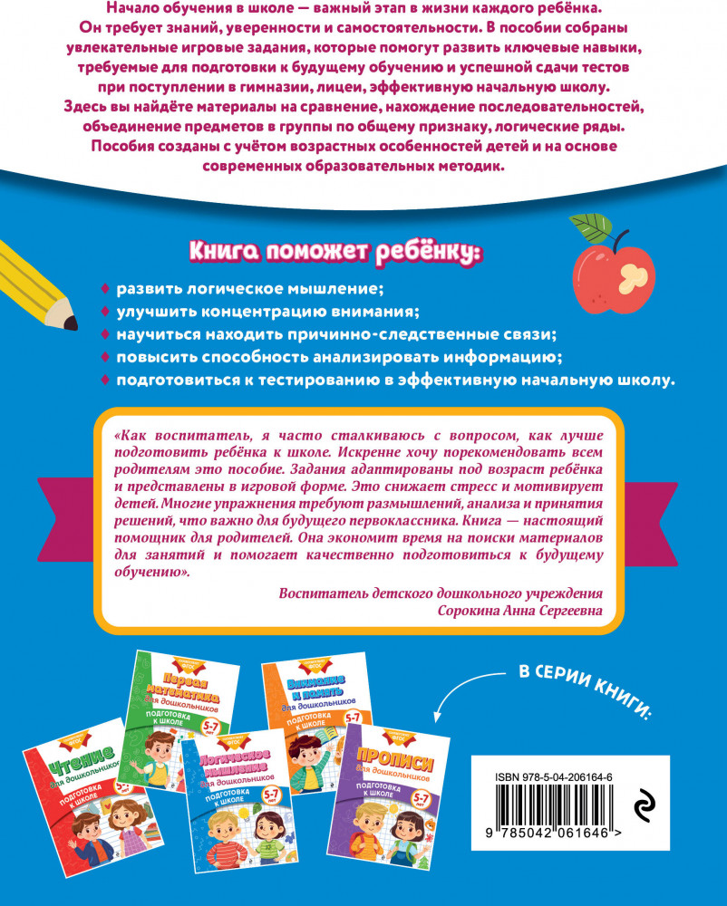 Серия: Книги для подготовки к школе Поступление в 1-й класс — важнейший этап в жизни ребёнка, и к нему нужно хорошо подготовиться. Тренажёр включает в себя задания разного типа на проверку степени усвоения базовых умений и навыков, необходимых для дальнейшего обучения. С помощью пособия можно проверить уровень развития логического мышления будущего первоклассника: умеет ли он устанавливать последовательности и закономерности, подбирать обобщающие слова, сравнивать и группировать предметы по определённым признакам, продолжать логические ряды, определять, что неправильно нарисовал художник. Задания, представленные в тренажёре, помогут оценить способности ребёнка, определить, с чем он справляется успешно, и выделить те области, которые вызывают у него затруднения. Книга-развивашка от издательства «Эксмо» будет полезна девочкам и мальчикам 5, 6, 7 лет для подготовки к школе. |