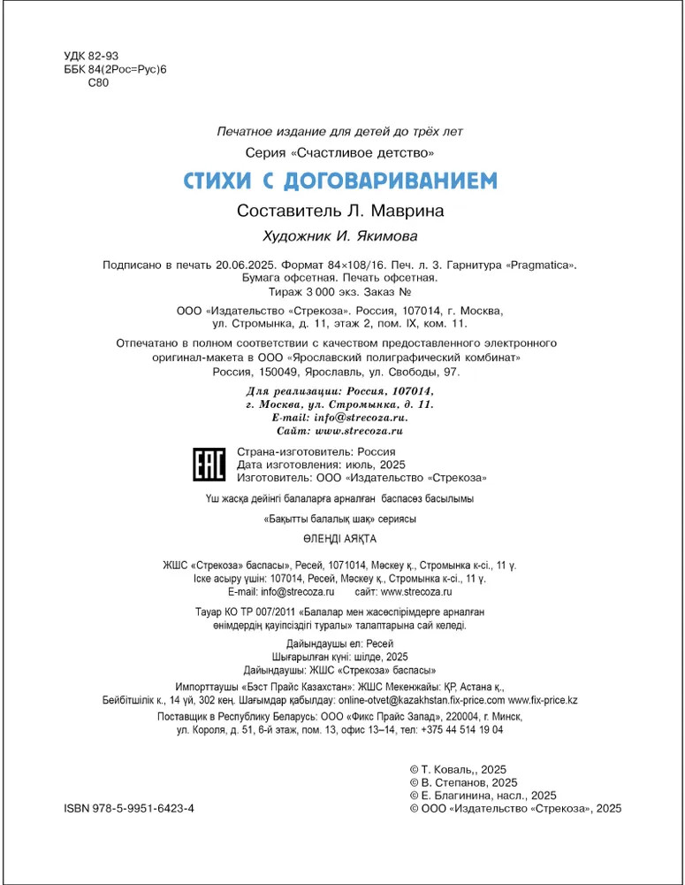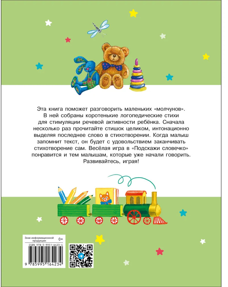 💳 Оплатить за товар можно при получении 🇰🇿 Есть бесплатная доставка по Казахстану от 1 дня 🎁 Копите бонусы с каждой покупки Серия: Счастливое детство Эта книга поможет разговорить маленьких «молчунов». В ней собраны коротенькие логопедические стихи для стимуляции речевой активности ребёнка. Сначала несколько раз прочитайте стишок целиком, интонационно выделяя последнее слово в стихотворении. Когда малыш запомнит текст, он будет с удовольствием заканчивать стихотворение сам. Весёлая игра в «Подскажи словечко» понравится и тем малышам, которые уже начали говорить. Развивайтесь, играя! |