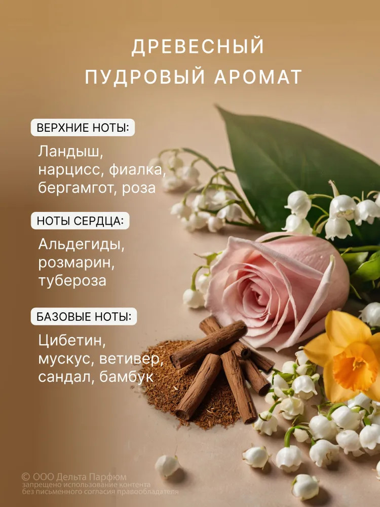 Туалетная вода женская обладает неповторимым шармом, благодаря своему семейству ароматов — цветочные, зелёные — и гармоничному сочетанию нот. Верхние ноты парфюма раскрываются нежным ландышем, очаровательным нарциссом, изящной фиалкой и благородной розой, создавая атмосферу весенней свежести. Ноты сердца раскрываются неповторимым альдегидным аккордом, который придает аромату особую глубину и объем. Дополняют его свежий розмарин и экзотическая тубероза, наполняя аромат яркими красками и акцентами. В базовых нотах парфюмированной воды вы услышите теплые и обволакивающие аккорды цибетина, сандала, бобов тонка и мускуса. Они создают неповторимый шлейф, который будет сопровождать вас в течение всего дня, оставляя после себя ощущение таинственности и загадочности.