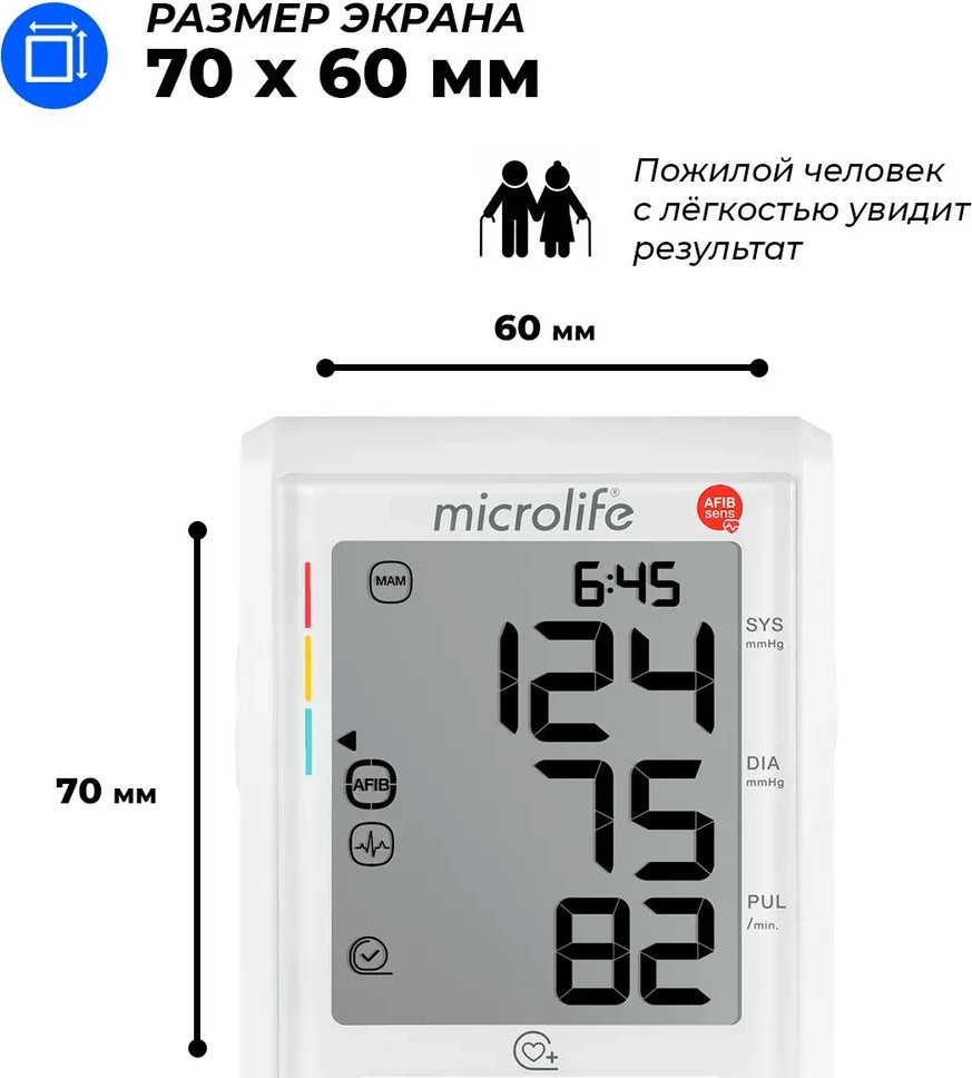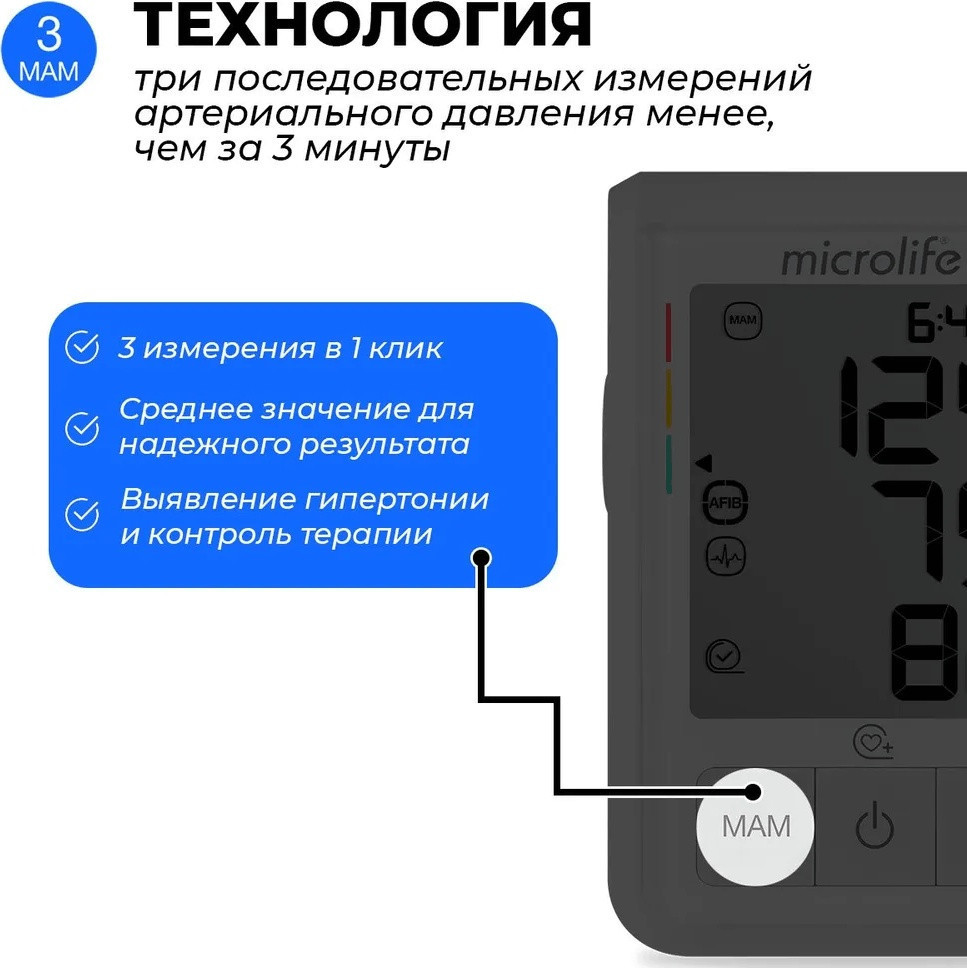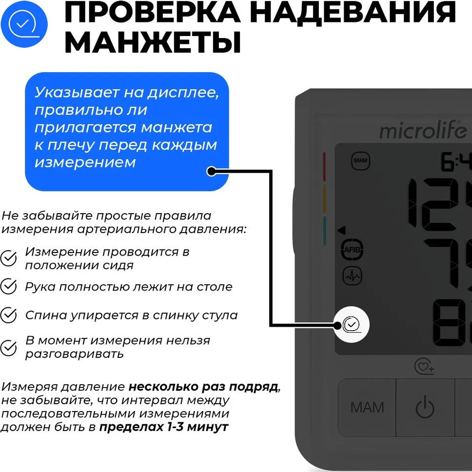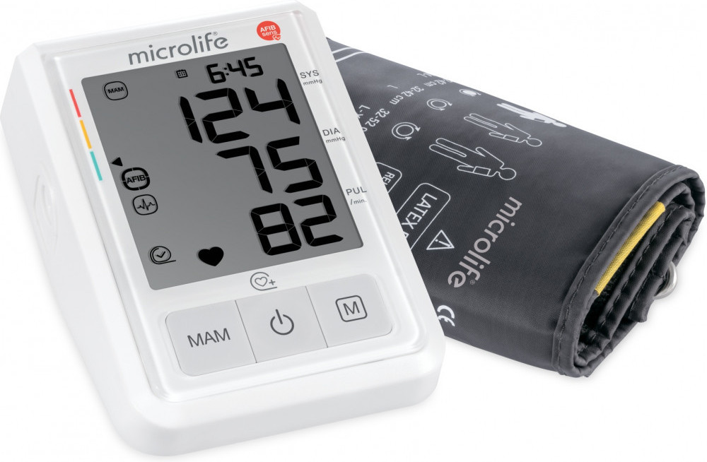 Тонометру Microlife BP B3 Afib присуждена наивысшая оценка A/A точности измерения артериального давления по результатам клинических испытаний Европейского Гипертонического Общества (ESH) и Британского Общества Гипертонии (BHS). Прибор оснащен уникальной технологией Gentle+, использование которой делает процесс измерения артериального давления безболезненным, а результат точным. Другое достоинство тонометра Microlife BP B3 Afib — наличие MAM-технологии (Microlife Average Mode), которая позволяет автоматически провести три последовательных измерения артериального давления, не снимая манжеты, с 15 секундным интервалом между измерениями. Далее тонометр анализирует полученные данные и выдает максимально точный результат. Вся процедура измерения занимает около 2 минут. Интеллектуальный алгоритм анализа позволяет исключить влияние на результат измерений таких факторов как аритмия, незначительные движения руки, недостаточный отдых перед измерением, волнение. Более того, МАМ-технология Microlife обеспечивает точное измерение давления даже при аритмии. Технология автоматически обнаруживает сердечные аритмии во время измерения артериального давления. Устройство выявляет признаки нерегулярного сердечного ритма с помощью технологии IHB (Irregular Heartbeat). О симптомах аритмии следует рассказать лечащему врачу.