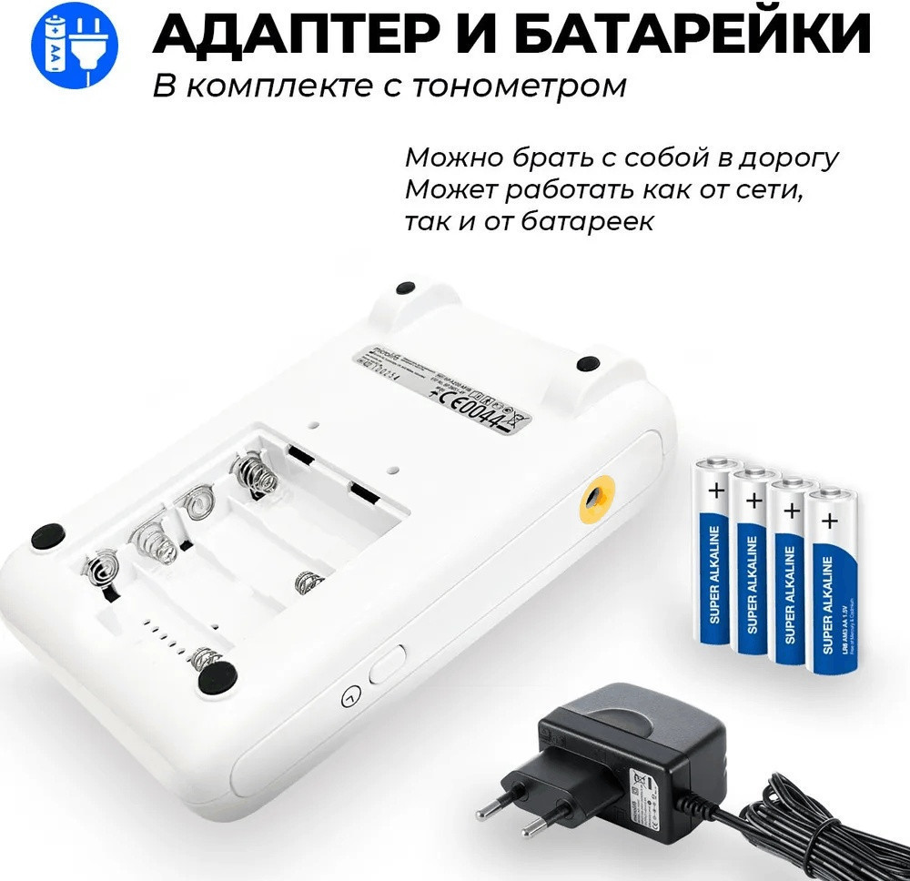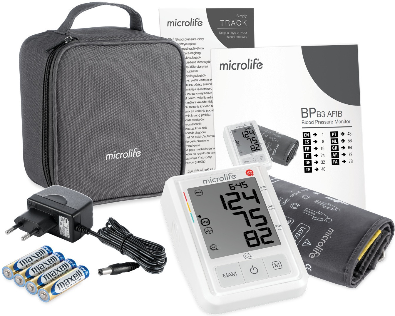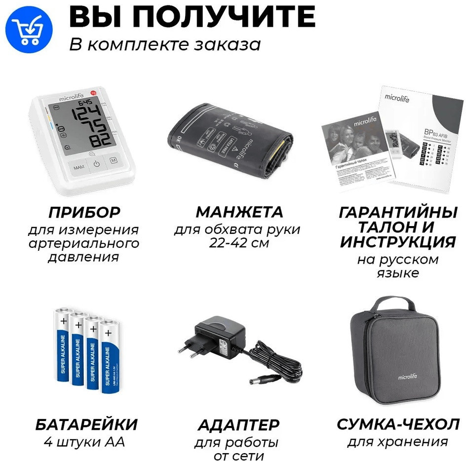 В комплекте: электронный блок с манжетой Microlife BP B3 Afib, конусообразная манжета на руку с длиной окружности плеча 22-42 см; комплект элементов питания: 4 типа AA, сетевой адаптер, сумка-чехол, руководство по эксплуатации, гарантийный талон.