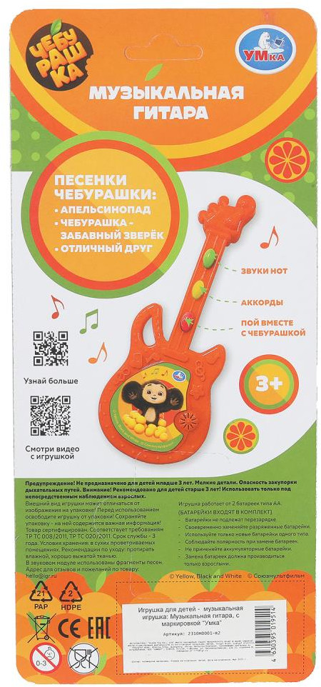 💳 Оплатить за товар можно при получении 🇰🇿 Есть бесплатная доставка по Казахстану от 1 дня 🎁 Копите бонусы с каждой покупки Серия: Чебурашка Мини-гитара «Чебурашка» ТМ «УМка» станет прекрасным подарком для ребёнка. Маленькому любознайке непременно понравится эта красочная игрушка в виде гитары. Малыш с удовольствием будет слушать весёлые мелодии из любимых мультфильмов и звуки настоящей гитары. |