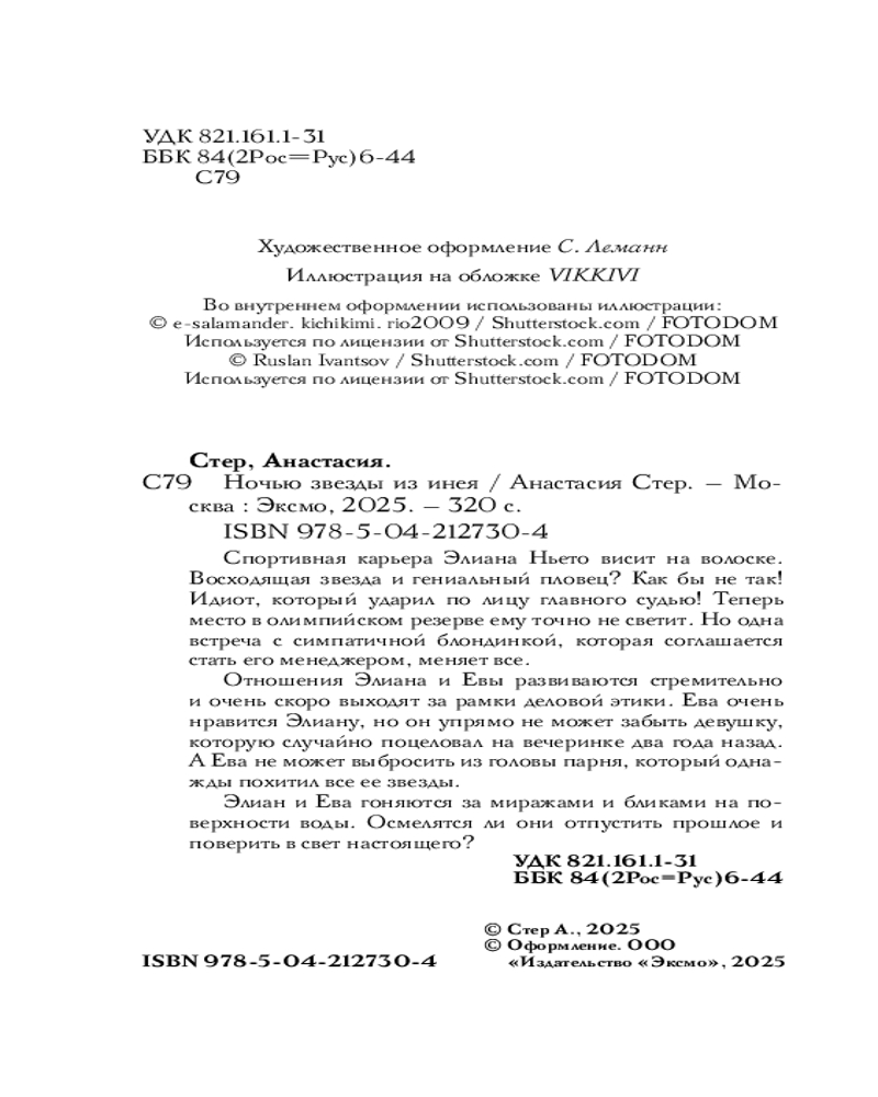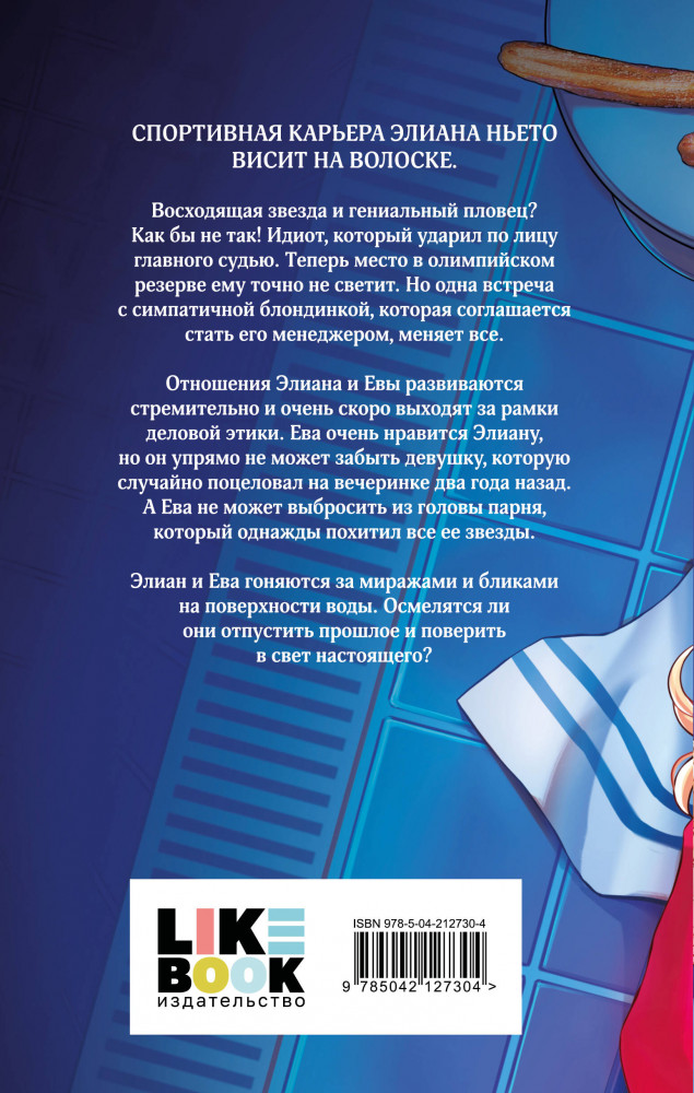 Серия: Sport romance. Спорт и поцелуи Спортивная карьера Элиана Ньето висит на волоске. Восходящая звезда и гениальный пловец? Как бы не так! Идиот, который ударил по лицу главного судью! Теперь место в олимпийском резерве ему точно не светит. Но одна встреча с симпатичной блондинкой, которая соглашается стать его менеджером, меняет всё. Отношения Элиана и Евы развиваются стремительно и очень скоро выходят за рамки деловой этики. Ева очень нравится Элиану, но он упрямо не может забыть девушку, которую случайно поцеловал на вечеринке два года назад. А Ева не может выбросить из головы парня, который однажды похитил все ее звезды. Элиан и Ева гоняются за миражами и бликами на поверхности воды. Осмелятся ли они отпустить прошлое и поверить в свет настоящего? |