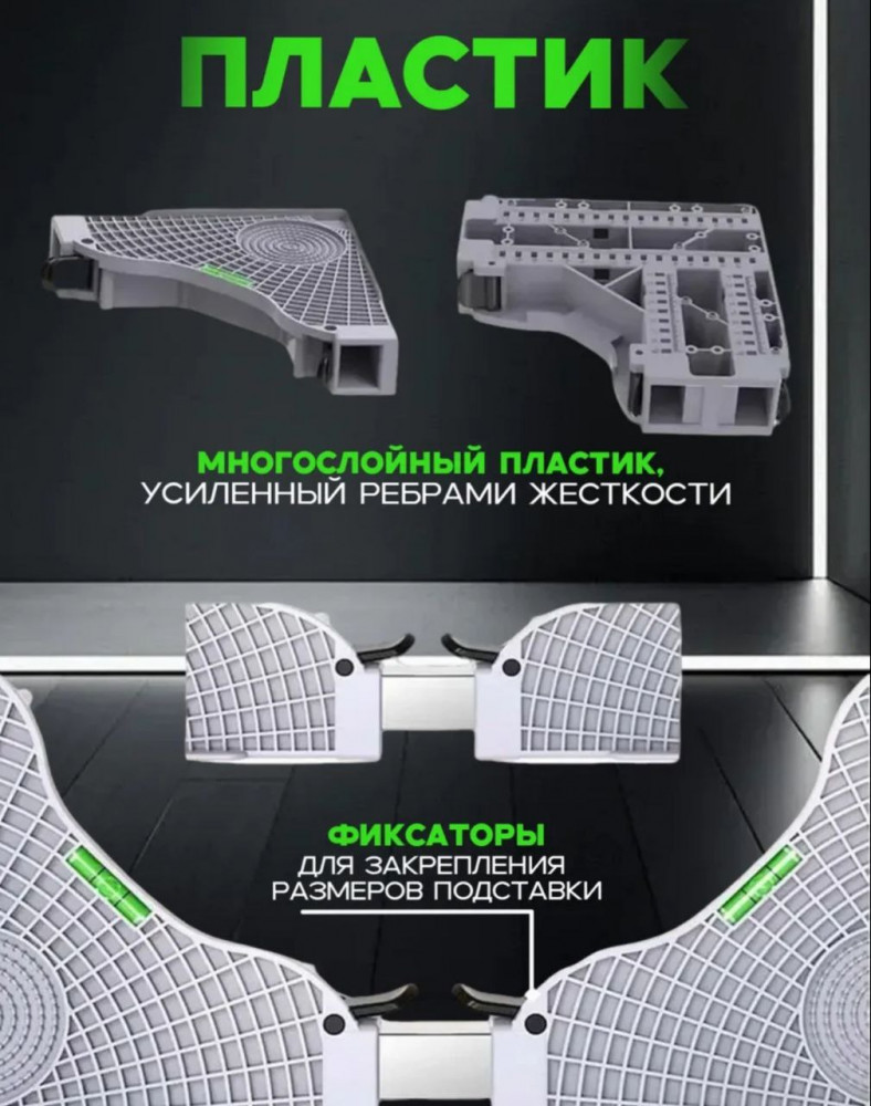 💳 Оплатить за товар можно при получении 🇰🇿 Есть бесплатная доставка по Казахстану от 1 дня 🎁 Копите бонусы с каждой покупки Подставка для мебели и стиральной машины — регулируемая, прочная. Универсальная подставка предназначена для стиральных машин, холодильников, шкафов, тумбочек и другой крупной бытовой техники. Подходит для большинства моделей и размеров. Изготовлена из прочного пластика и усиленных труб, выдерживает большие нагрузки и обеспечивает надёжную устойчивость. |