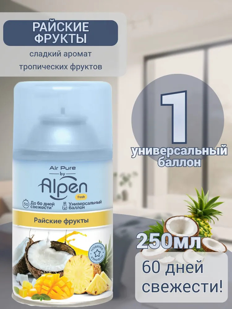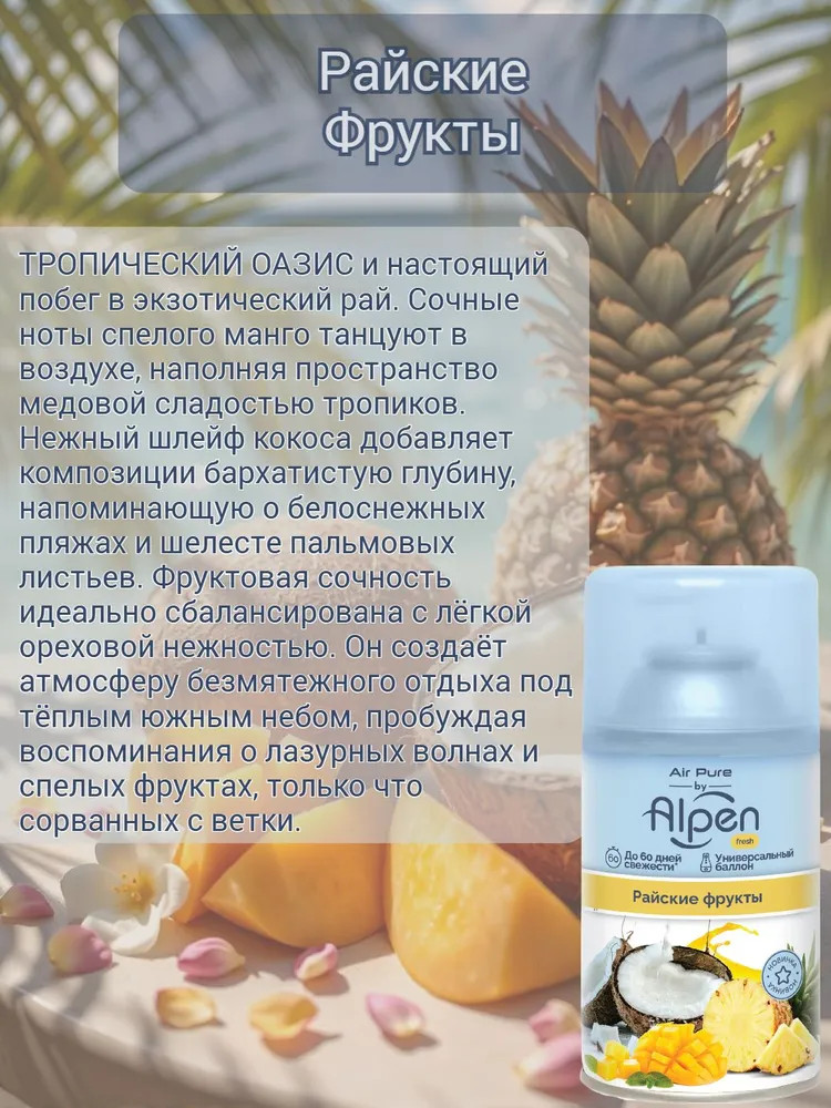 Alpen Fresh — это не просто продукт, это возможность создать уникальную атмосферу в любом помещении. Наполните свой дом гармонией и комфортом, позволяя аромату вернисажа оздоравливать ваше пространство и делать каждое мгновение особенным. Преимущества выбора данного сменного баллона очевидны: это удобство, многофункциональность и высокое качество аромата.