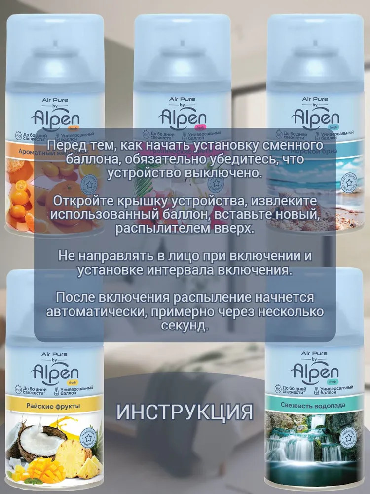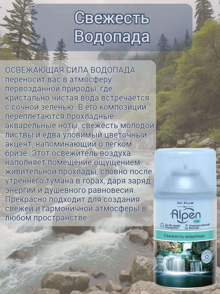 Alpen Fresh — это не просто продукт, это возможность создать уникальную атмосферу в любом помещении. Наполните свой дом гармонией и комфортом, позволяя аромату вернисажа оздоравливать ваше пространство и делать каждое мгновение особенным. Преимущества выбора данного сменного баллона очевидны: это удобство, многофункциональность и высокое качество аромата.