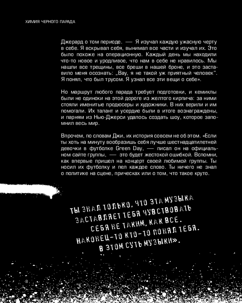 Серия: Поп-культ: музыканты, покорившие чарты и сердца Окунитесь в нулевые! «Химия Черного Парада» — фанатская книга об истории одного из главных коллективов своей эпохи и ваш персональный портал в прошлое. Биография культовой группы My Chemical Romance идеально подойдет ценителям альтернативной музыки, а также всем, кто ностальгирует по одной из лучших эпох сцены. Найдите старый плеер, достаньте проводные наушники и включите «I’m Not Okay», «Cancer» и «Teenagers». Сделали? Теперь возьмите в руки книгу и читайте о том, как были созданы эти и многие другие культовые треки коллектива. Внутри вы найдете интервью с участниками группы, большое количество фотографий и интересных фактов, которые вдохновят идти вперед, несмотря ни на что. |