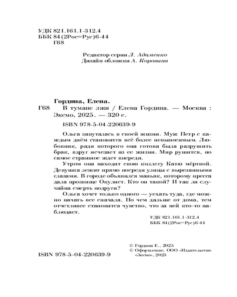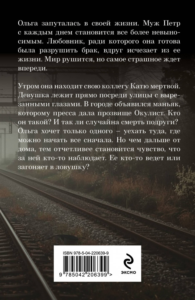💳 Оплатить за товар можно при получении 🇰🇿 Есть бесплатная доставка по Казахстану 🎁 Копите бонусы с каждой покупки Серия: Ловушки судьбы. Детективы Елены Гординой Ольга запуталась в своей жизни. Муж Петр с каждым днем становится все более невыносимым. Любовник, ради которого она готова была разрушить брак, вдруг исчезает из ее жизни. Мир рушится, но самое страшное ждет впереди. Утром она находит свою коллегу Катю мертвой. Девушка лежит прямо посреди улицы с вырезанными глазами. В городе объявился маньяк, которому пресса дала прозвище Окулист. Кто он такой? И так ли случайна смерть подруги? Ольга хочет только одного — уехать туда, где можно начать все сначала. Но чем дальше от дома, тем отчетливее становится чувство, что за ней кто-то наблюдает. Ее кто-то ведет или загоняет в ловушку? |