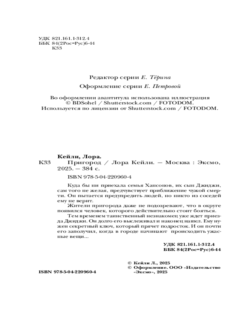 💳 Оплатить за товар можно при получении 🇰🇿 Есть бесплатная доставка по Казахстану от 1 дня 🎁 Копите бонусы с каждой покупки Серия: Кто-то всегда лжёт. Триллеры Л. Кейли Куда бы ни приехала семья Хансонов, их сын Джиджи, сам того не желая, предчувствует приближение чужой смерти. Он пытается предупредить людей, но никто из соседей ему не верит. Жители пригорода даже не подозревают, что в округе появился человек, которого действительно стоит бояться. Тем временем таинственный незнакомец уже ждет приезда Джиджи. Он долго его выслеживал и наконец нашел. Ему нужен секретный ключ, который прячет подросток, и он почти его заполучил, когда в городе начинают происходить ужасные вещи... |