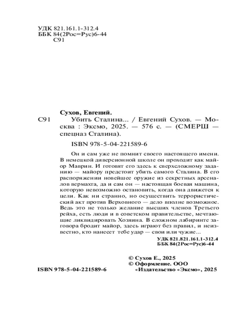 💳 Оплатить за товар можно при получении 🇰🇿 Есть бесплатная доставка по Казахстану от 1 дня 🎁 Копите бонусы с каждой покупки Серия: Смерш — спецназ Сталина (обложка) Он и сам уже не помнит своего настоящего имени. В немецкой диверсионной школе он проходит как майор Маврин. И готовят его здесь к сверхсложному заданию — майору предстоит убить самого Сталина. В его распоряжении новейшее оружие из секретных арсеналов вермахта, да и сам он — настоящая боевая машина, которую невозможно остановить, когда она движется к цели. Как ни странно, но осуществить террористический акт против Верховного — дело вполне возможное. Ведь это не только желание высших членов Третьего рейха, есть люди и в советском правительстве, мечтающие ликвидировать Хозяина. В сложном лабиринте заговора бродит майор, здесь играют без правил, и неизвестно, кто нанесет тебе удар — свои или чужие... |