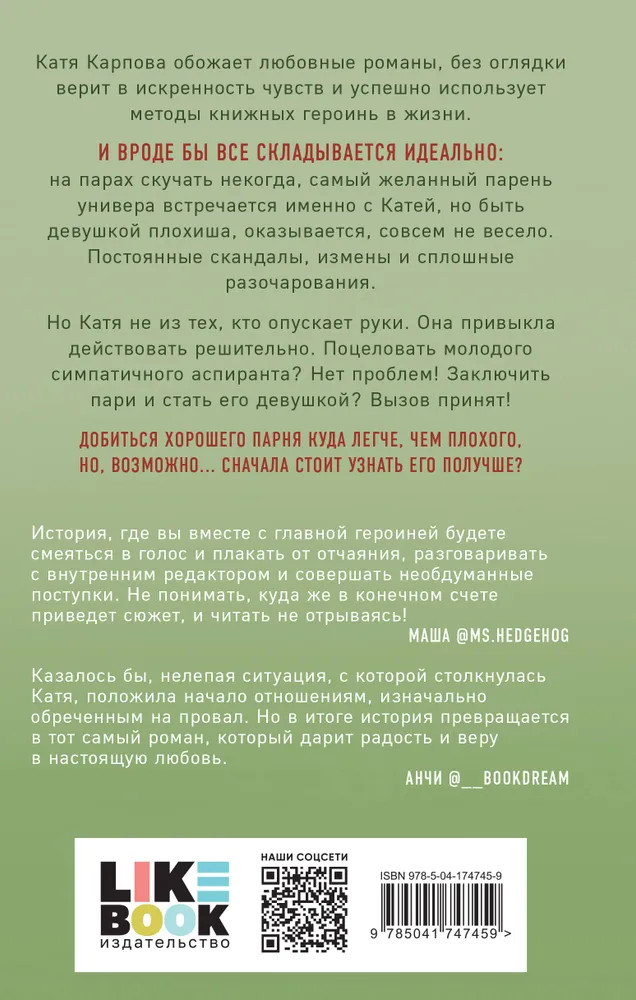 Катя Карпова обожает любовные романы, без оглядки верит в искренность чувств и успешно использует методы книжных героинь в жизни. И вроде бы все складывается идеально: на парах скучать некогда, самый желанный парень универа встречается именно с Катей, но быть девушкой плохиша, оказывается, совсем не весело. Постоянные скандалы, измены и сплошные разочарования. Но Катя не из тех, кто опускает руки. Она привыкла действовать решительно. Поцеловать молодого симпатичного аспиранта? Нет проблем! Заключить пари и стать его девушкой? Вызов принят! Добиться хорошего парня куда легче, чем плохого, но, возможно... сначала стоит узнать его получше? |