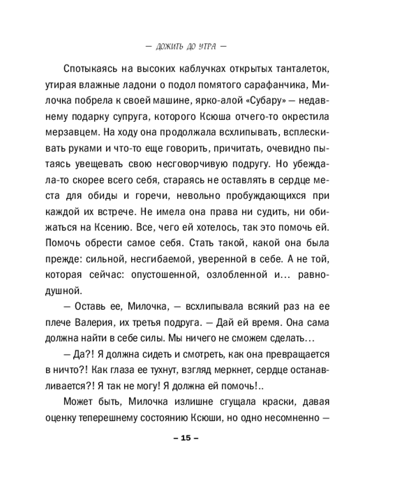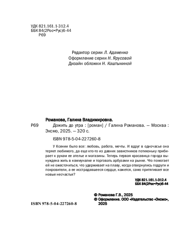 Серия: Криминальный роман: любовь и преступление (обложка) У нее было все: любовь, работа, мечты. И вдруг в одночасье она теряет любимого, да еще кто-то из давних завистников потихоньку прибирает к рукам ее ателье и магазины. Теперь первая красавица города вынуждена жить в коммуналке и торговать арбузами на рынке. Что помогает ей не ожесточиться, что удерживает на плаву, когда отвернулись подруги и покровители, а ее исстрадавшееся сердце, кажется, само притягивает все новые несчастья? |