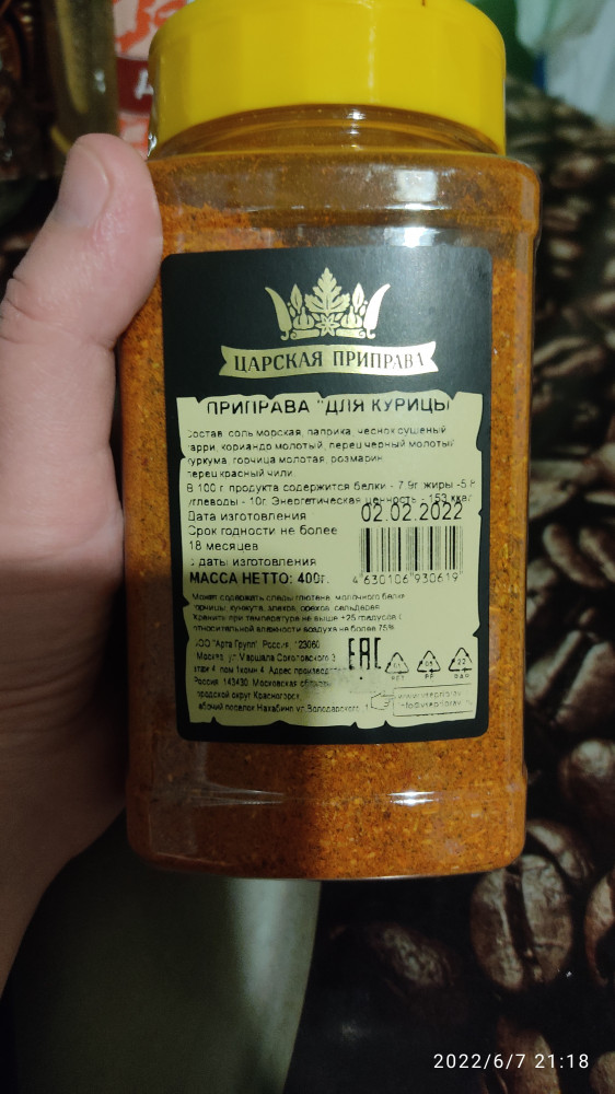Приправа свежая, пахнет замечательно, все для вкусной курочки, Спасибо производителям и за отличную расфасовку, баночка не стеклянная, многоразовая, специи все свежие, не просроченные, вес соответствует. Будем пользоваться долго и с удовольствием, рекомендую!...Взяли по Акции (3+1) и эта специя была четвертая и шла в подарок, спасибо всей команде Flip за доставленное удовольствие.