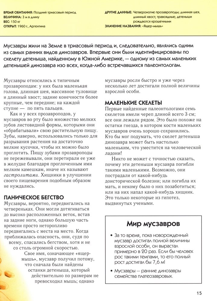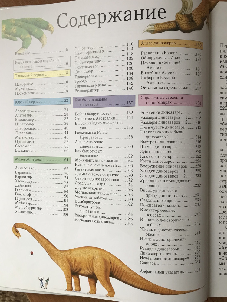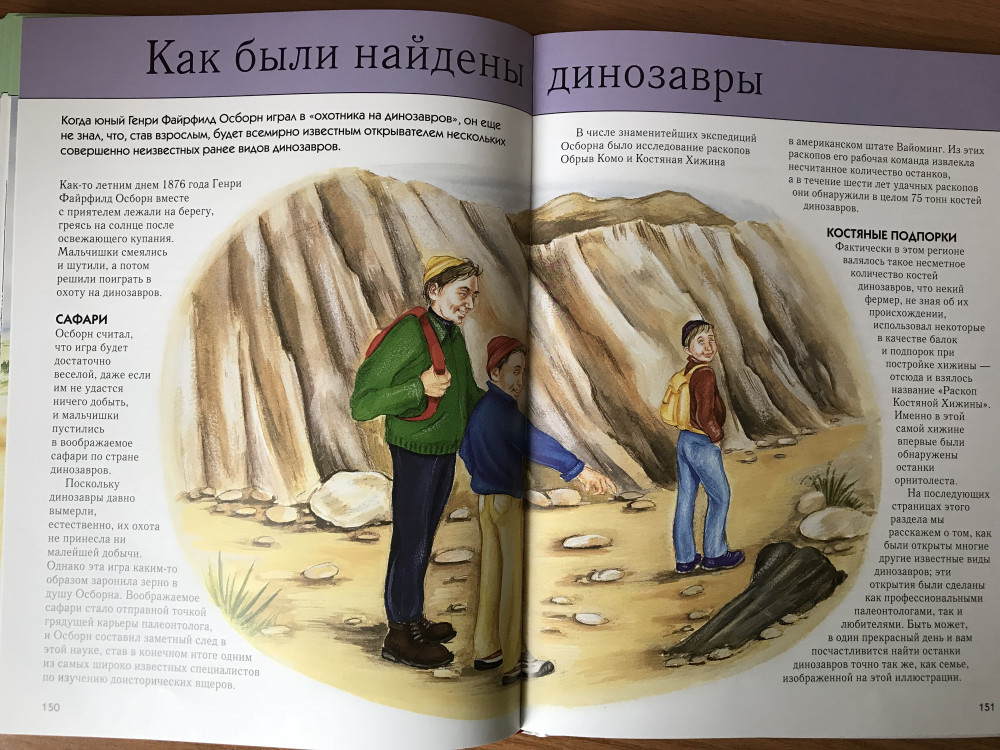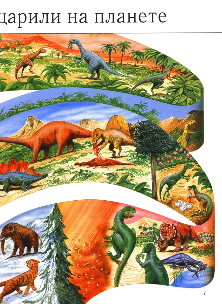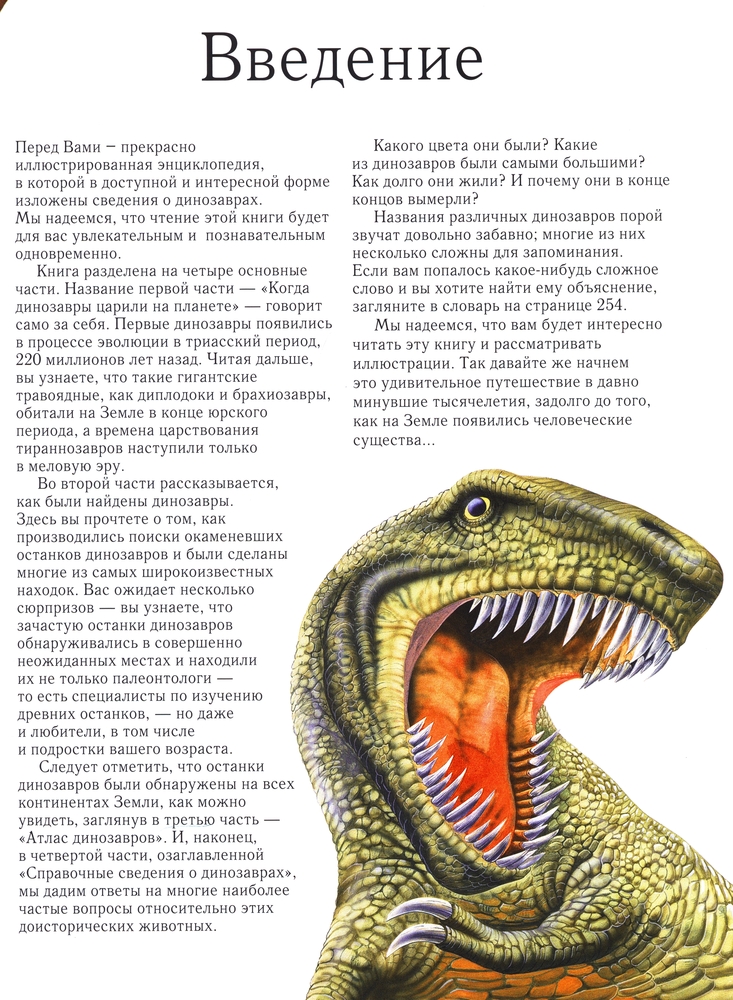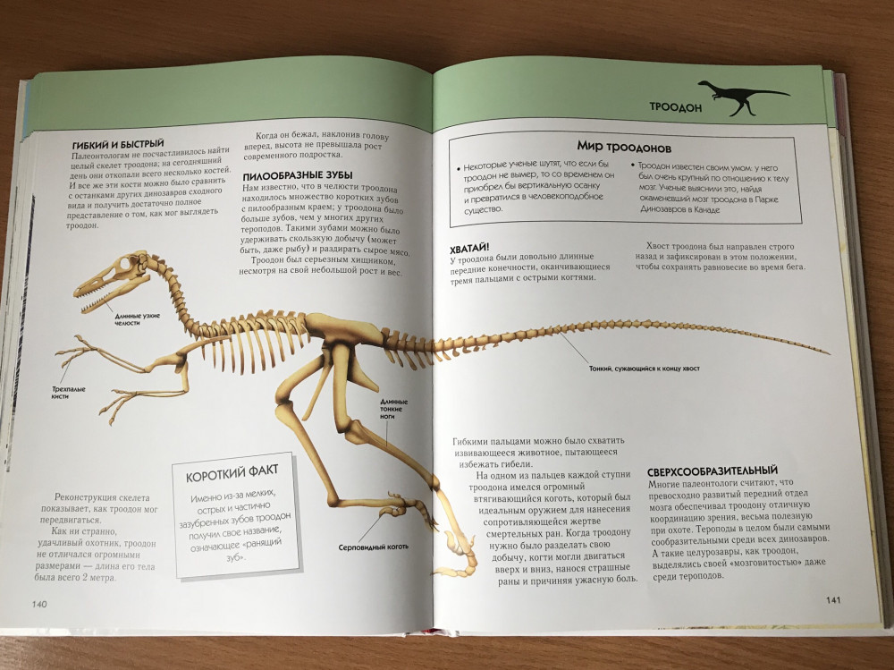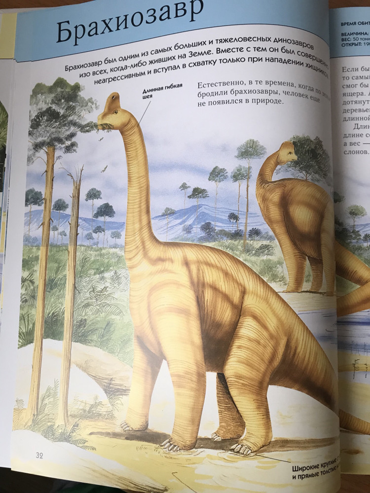 Книга яркая, красочная; материал интересный, описание каждого динозавра занимает 4 страницы. Немного разочаровало то, что половина книги - это описание как, где и когда нашли те или иные кости динозавров.