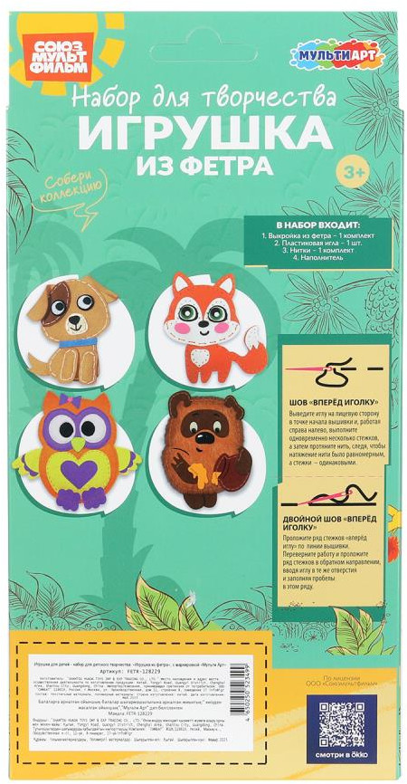 💳 Оплатить за товар можно при получении 🇰🇿 Есть бесплатная доставка по Казахстану от 1 дня 🎁 Копите бонусы с каждой покупки Серия: Союзмультфильм Набор для шитья — игрушка из фетра «Союзмультфильм. Львёнок» ТМ «Мульти Арт» — отличный подарок для ребёнка, который будет способствовать развитию её творческих способностей. Такой набор непременно понравится маленьким рукодельникам: с его помощью можно создать интересную вещь собственными руками и получить массу приятных эмоций в процессе работы с ним. В комплект входит всё необходимое, чтобы сразу приступить к созданию игрушки. В целях безопасности игла из набора изготовлена из пластика и специально затуплена. При этом на выкройках имеются крупные отверстия, в которые инструмент без труда входит. Подробная инструкция, в свою очередь, поможет не запутаться в последовательности действий. Готовую поделку можно подарить родным или друзьям, а также использовать в своих играх: брать её с собой спать, на прогулку или в путешествие. |