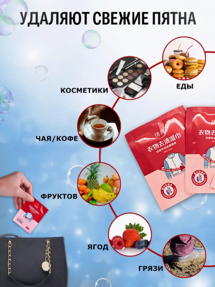 Влажные пятновыводящие салфетки — это универсальное средство для экспресс-удаления пятен на одежде, верхней одежде, мебели и обуви. Они подходят для всех видов ткани и эффективно справляются с различными загрязнениями: жиром, чернилами, грязью и следами от еды. Благодаря пропитке чистящим средством обеспечивается моментальное очищение вещей без необходимости стирки или использования отбеливателей. Каждая салфетка находится в индивидуальной упаковке, что позволяет взять их с собой в дорогу, поездку или путешествие. Удобно использовать дома, в машине или кармане — они не занимают много места и всегда под рукой.