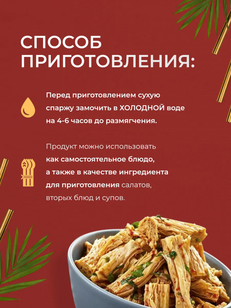 Спаржа соевая сухая легко готовится — просто замочите ее в воде на несколько часов, чтобы она разбухла, затем добавьте к ней бульон или овощи и грибы. Она идеально подходит для приготовления ваших любимых блюд азиатской кухни, супов, салатов или в качестве начинки для роллов. Также вкусна маринованная спаржа фучжу или закуска корейская спаржа — просто добавьте к сухой соевой спарже приправу для корейских салатов Айдиго.