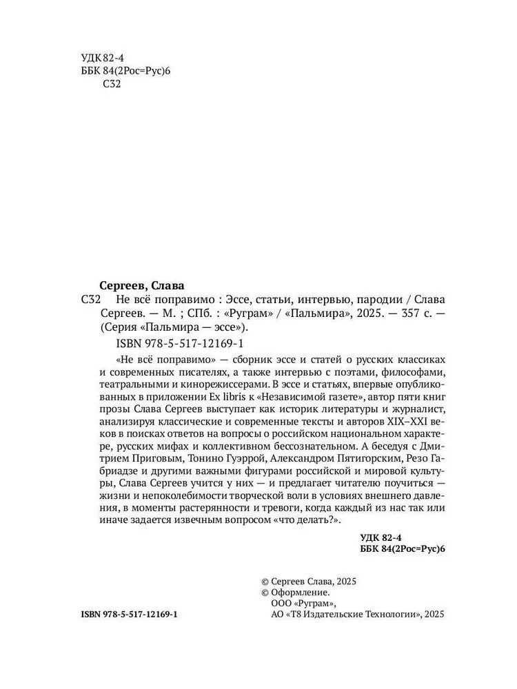 Серия: Пальмира — эссе «Не всё поправимо» — сборник эссе и статей о русских классиках и современных писателях, а также интервью с поэтами, философами, театральными и кинорежиссерами. В эссе и статьях, впервые опубликованных в приложении Ex libris к «Независимой газете», автор пяти книг прозы Слава Сергеев выступает как историк литературы и журналист, анализируя классические и современные тексты и авторов XIX–XXI веков в поисках ответов на вопросы о российском национальном характере, русских мифах и коллективном бессознательном. А беседуя с Дмитрием Приговым, Тонино Гуэррой, Александром Пятигорским, Резо Габриадзе и другими важными фигурами российской и мировой культуры, Слава Сергеев учится у них — и предлагает читателю поучиться — жизни и непоколебимости творческой воли в условиях внешнего давления, в моменты растерянности и тревоги, когда каждый из нас так или иначе задается извечным вопросом «что делать?». |