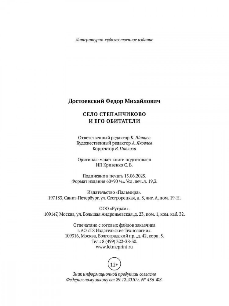 Серия: Пальмира — Достоевский «Село Степанчиково и его обитатели» — сатирическая повесть Федора Михайловича Достоевского (1821-1881), ставшая важным этапом на пути к написанию Великого пятикнижия. Так, в идеально прекрасном полковнике Ростаневе можно разглядеть черты князя Мышкниа («Идиот»), а в фигуре Фомы Опискина узнается еще не написанный образ Федора Павловича Карамазова («Братья Карамазовы»). Реальным же прототипом Фомы Опискина выступал Николай Васильевич Гоголь (1809-1851), которого Достоевский обвинял в лукавстве и «паясничании» после прочтения «Выбранных мест из переписки с друзьями». О классическом статусе «Села Степанчикова...» говорит хотя бы тот факт, что повесть выдержала более десяти экранизаций и постановок, в том числе на сценах МХАТа, петербургского БДТ, Театра им. Моссовета и др. |