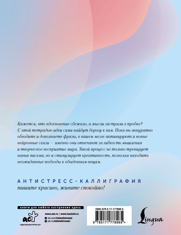 Серия: Антистресс-каллиграфия Чувствуете, что творческое мышление зашло в тупик, а вдохновение словно заблокировано? Эта тетрадь — ваш верный спутник на пути к новым идеям и нестандартным решениям. Пока вы аккуратно обводите и дополняете фразы, в вашем мозге активируются новые нейронные связи — именно они отвечают за гибкость мышления и творческое восприятие мира. Такой процесс не только тренирует навык письма, но и стимулирует креативность, позволяя находить неожиданные подходы к обыденным вещам. Это не просто каллиграфия, а увлекательная тренировка ума, которая поможет раскрыть потенциал и наполнить жизнь новыми красками. «Взрослые прописи для вдохновения» — для тех, кто хочет не просто писать красиво, но и жить ярко. |