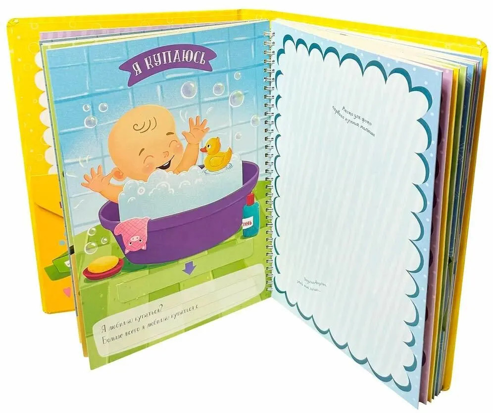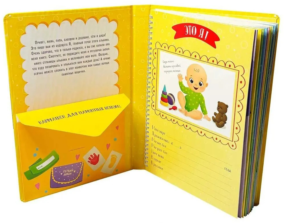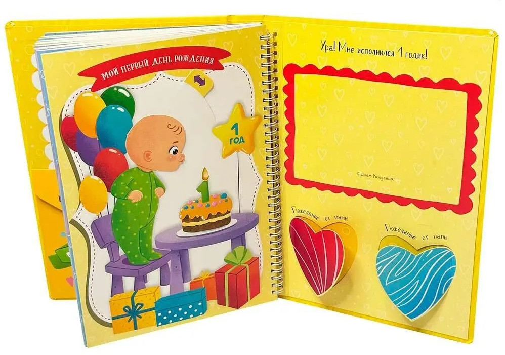Вы любите рассматривать свои детские фотографии? Мы очень любим! И наши дети тоже. С появлением цифрового фото все реже можно увидеть в домах бумажные снимки. И времена фотоальбомов тоже проходят. Но первый год жизни вашего малыша заслуживает того, чтобы превратить воспоминания об этом чудесном времени в настоящую семейную реликвию. Согласны? Мы решили сделать совершенно необычный альбом для самых дорогих фото. Не просто альбом, а интерактивную книгу, в которую можно играть. Каждый разворот книги — это большое событие пока еще маленькой жизни. Живые картинки можно двигать, открывать, крутить, а рядом есть место для фотографий вашего непоседы. Обо всех событиях можно оставить в альбоме короткие заметки, а необычные интерактивные странички-дневнички позволят записывать рост, вес, первые умения каждый месяц. Для памятных вещичек — бирочки из роддома, пряди волосиков, отпечатки маленьких ножек или ладошек — есть специальный карман. Ни один момент первого года жизни не останется без внимания. А чуть позже подросший малыш не просто будет рассматривать свои детские фото, а сможет поиграть с кни гой в свою историю. |