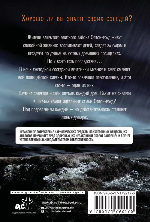 Серия: Объявлено убийство (м) Хорошо ли вы знаете своих соседей? Жители закрытого элитного района Олтон-роуд живут спокойной жизнью: воспитывают детей, следят за садом и беседуют по душам на уютных домашних посиделках. Но у всего есть последствия... В ночь ежегодной соседской вечеринки музыку и смех сменяет вой полицейской сирены. Кто-то совершил преступление, и этот кто-то — один из них. Паутина секретов и тайн опутала каждый дом. Какие же скелеты в шкафах хранят идеальные семьи Олтон-роуд? Под подозрением каждый — но действительность страшнее любых догадок. |