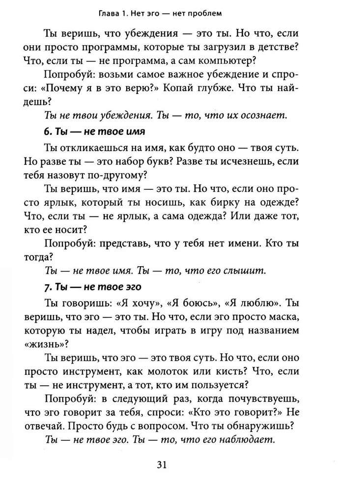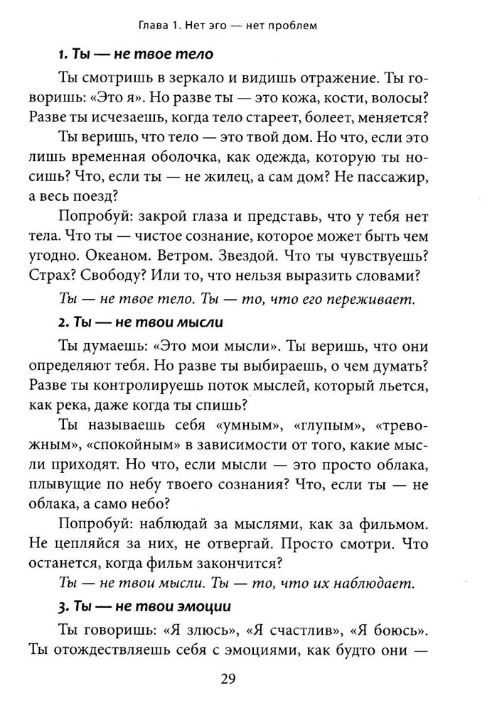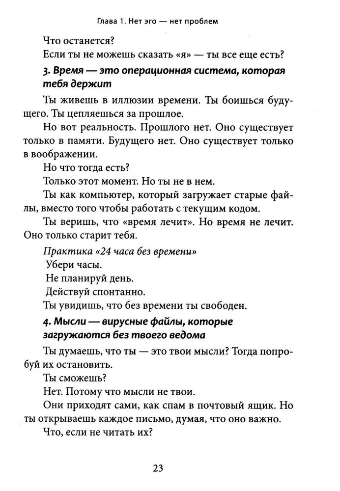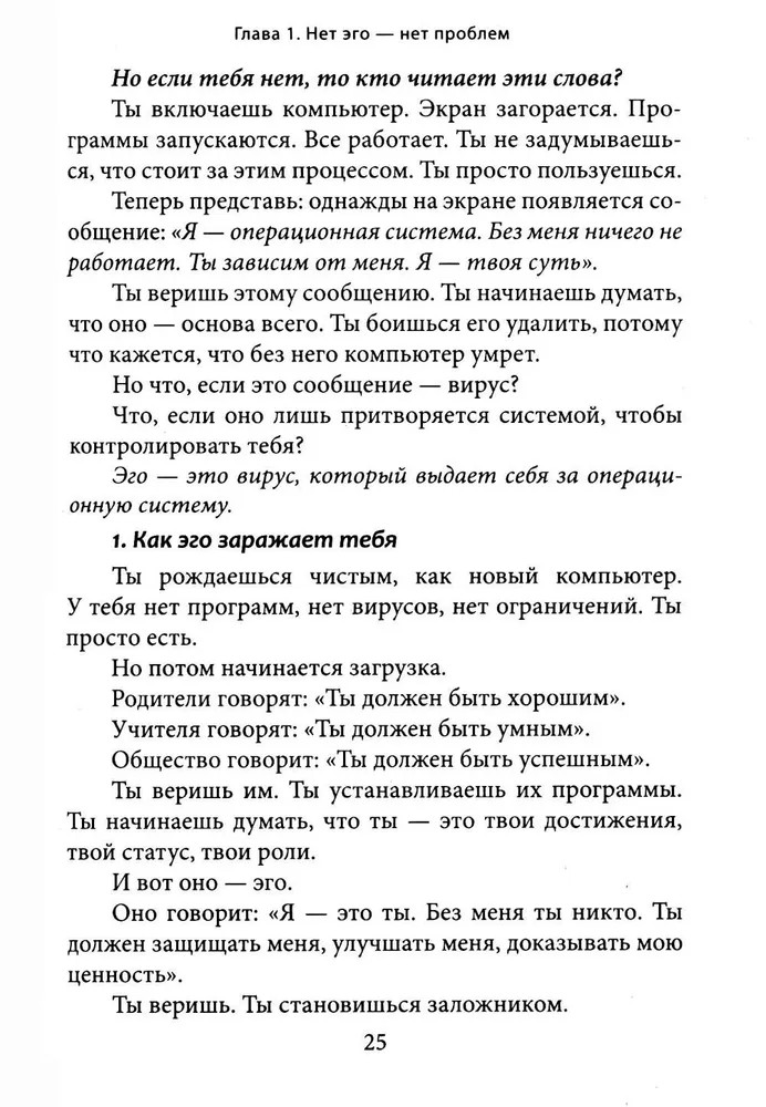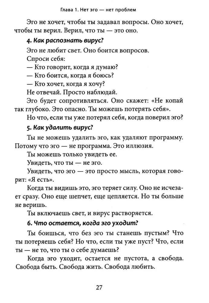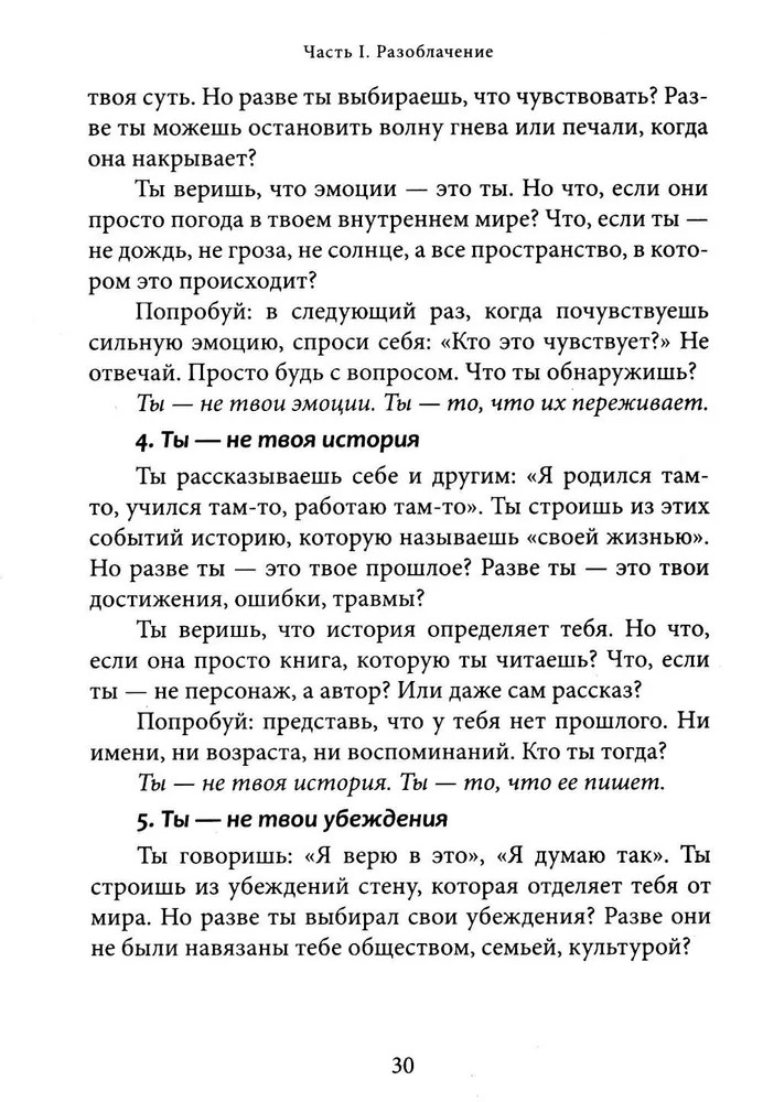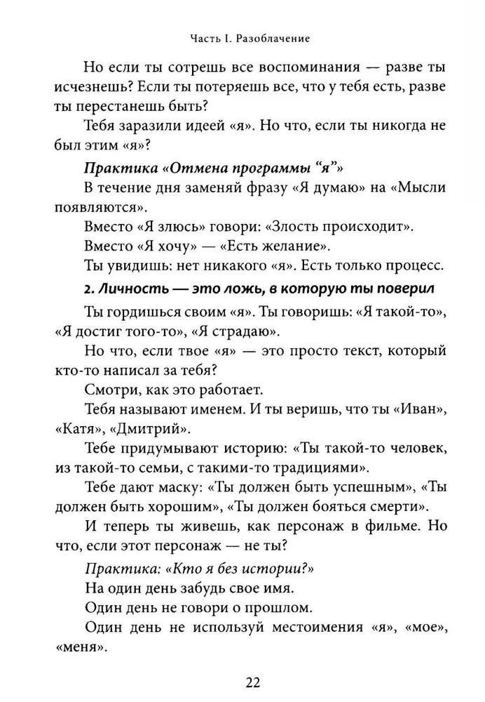 Перед вами книга-трансформация. Она несет свободу и пробуждение. Если вдруг кажется, что жизнь идет по кругу, что мысли и страхи держат вас в ловушке, что вы ищете себя, но каждый раз натыкаетесь на стену, — значит, пора остановиться. Вы не механизм, работающий на автопилоте. Вы не набор ролей, привычек и ожиданий. Все, что вы считали собой, лишь сценарий, который можно оставить позади. Эта книга не создает новых верований. Она разрушает иллюзии. Это не теория и не философия. Это прямой опыт, разрушающий привычные границы. Вы не станете «лучшей версией себя», — вы увидите, что вам никогда не нужно было становиться кем-то другим. |